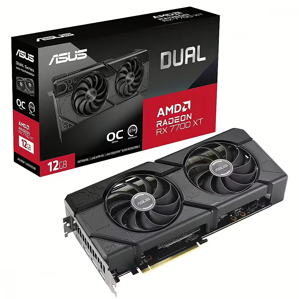 LongDesc - 2x Fans. 2x Fun.Delivering the latest AMD RDNA™ 3 architecture experience in its purest form, the ASUS Dual Radeon™ RX 7700 XT OC Edition melds performance and simplicity like no other. Leveraging advanced cooling technologies derived from flagship graphics cards, the Dual opts for substance over style, the perfect choice for a well-balanced build. Buckle up and engage cutting-edge gaming prowess.Axial-tech Fan DesignBetter, faster, strongerTwo tried-and-true Axial-tech fans feature a smaller hub that facilitates longer blades and a barrier ring to increase downward air pressure.Auto-Extreme TechnologyPrecision automated manufacturingAuto-Extreme Technology is an automated manufacturing process that sets new standards in the industry by allowing all soldering to be completed in a single pass. This reduces thermal strain on components and avoids the use of harsh cleaning chemicals, resulting in less environmental impact, lower manufacturing power consumption, and a more reliable product overall.GPU TWEAK IIIMonitor, tweak, and tuneThe ASUS GPU Tweak III utility takes graphics card tuning to the next level. It allows you to tweak critical parameters including GPU core clocks, memory frequency, and voltage settings, with the option to monitor everything in real-time through a customizable on-screen display. Advanced fan control is also included along with many more features to help you get the most out of your graphics card.Pair with a PSUUse our wattage calculator to estimate how much power you’ll need to fuel your rig, and then pick a compatible ROG Thor, ROG Loki or ROG Strix AURA power supply for ultimate performance.