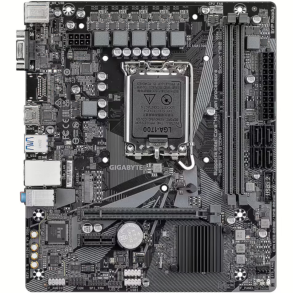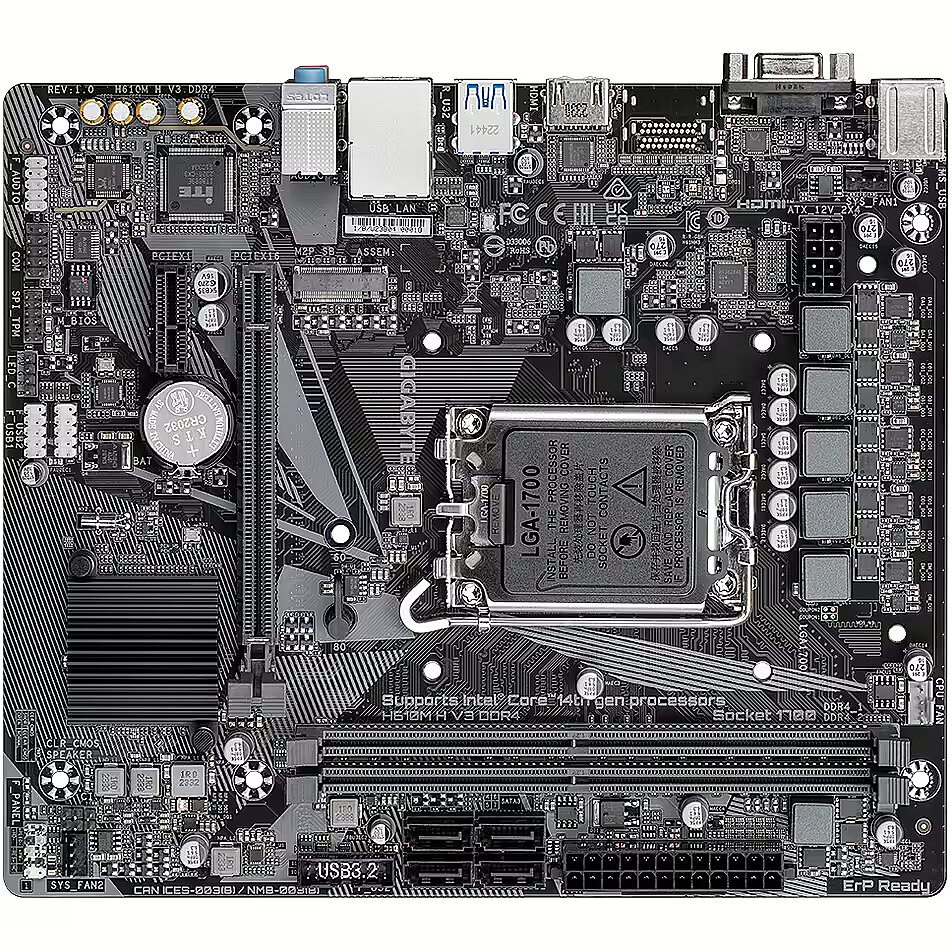 ShortSummaryDescription - GIGABYTE H610M H V3 DDR4 Motherboard - Supports Intel Core 14th CPUs, 4+1+1 Hybrid Phases Digital VRM, up to 3200MHz DDR4, 1xPCIe 3.0 M.2, GbE LAN, USB 3.2 Gen 1, Intel, LGA 1700, Intel® Celeron®, Intel® Core™ i3, Intel® Core™ i5, Intel® Core™ i7, Intel® Core™ i9,..., LGA 1700, DDR4-SDRAM, 64 GB