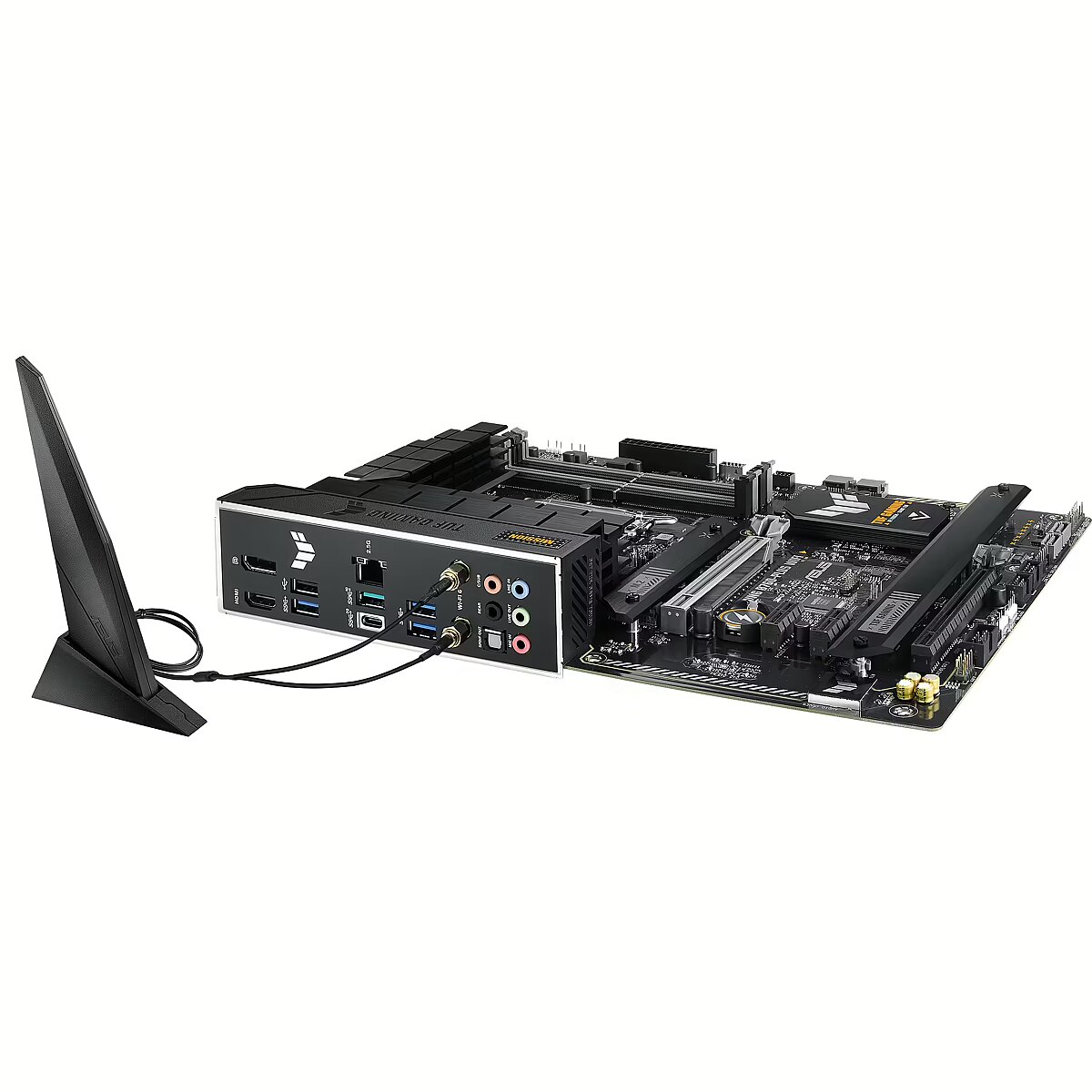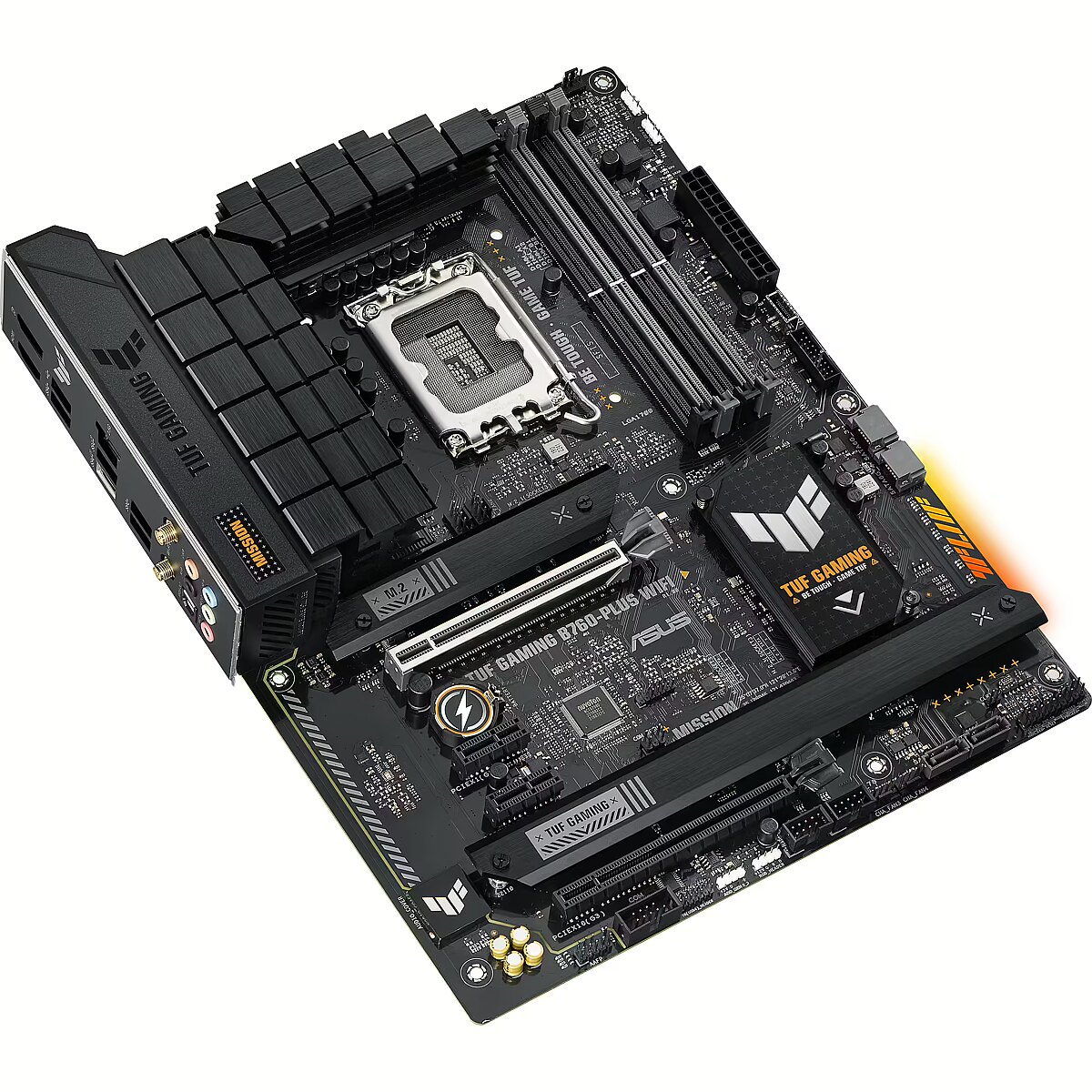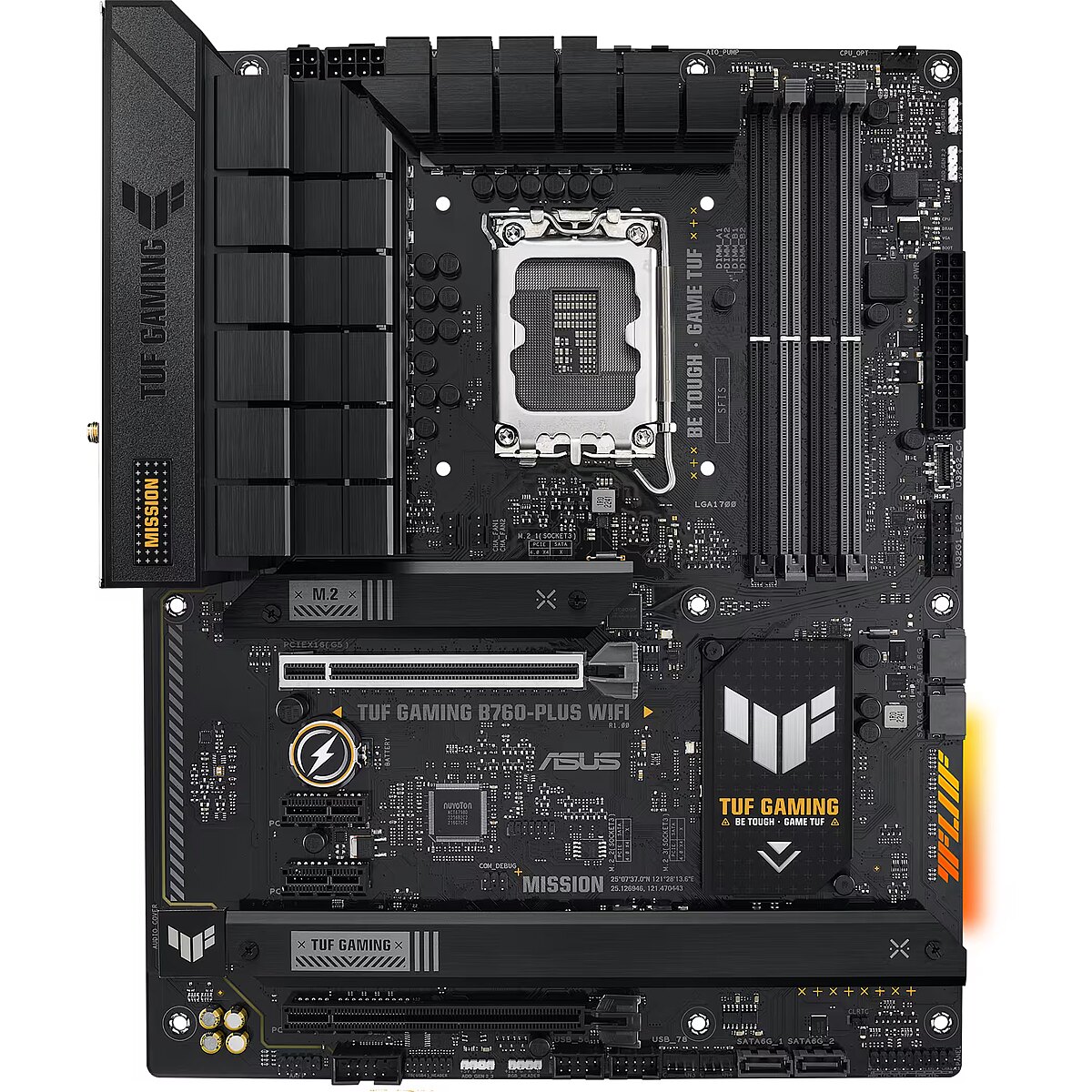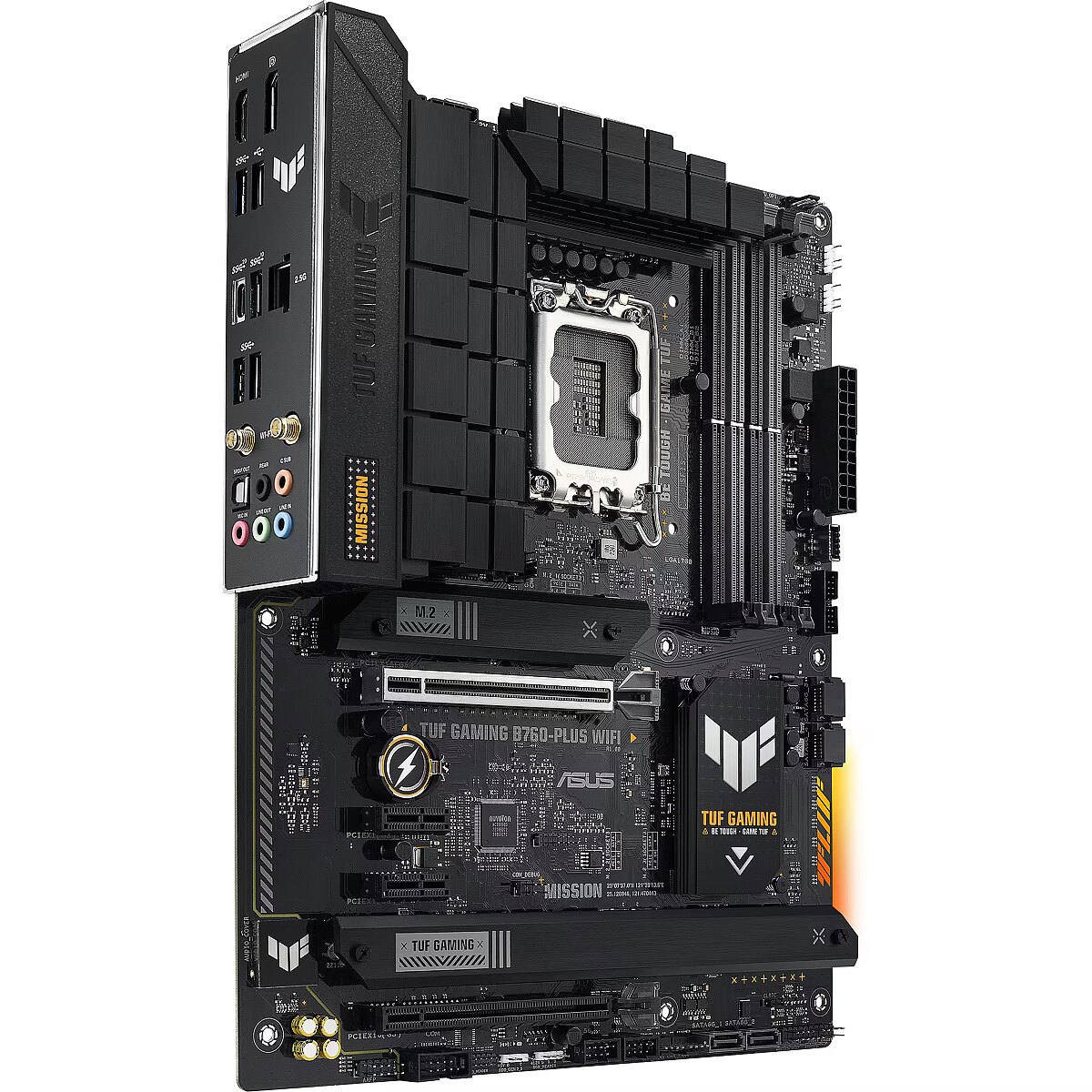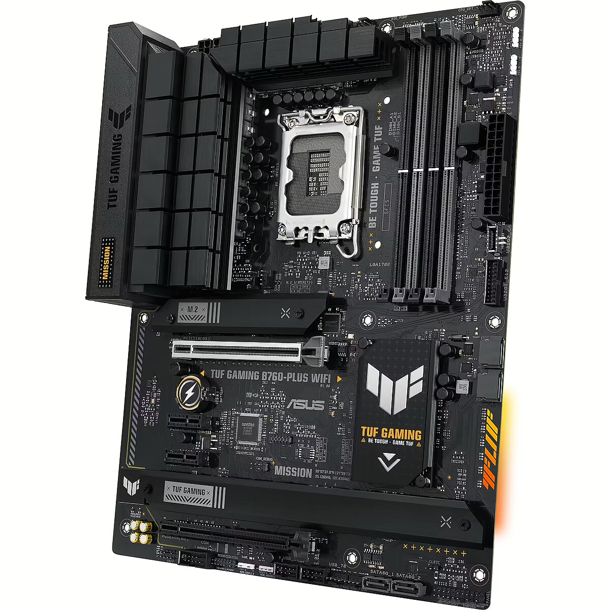 Description - TUF Gaming B760-Plus Wi-Fi TUF Gaming B760-Plus WiFi takes all the essential elements of the latest Intel processors and combines them with gaming-ready features and proven durability. Designed with military-grade components, an enhanced power solution and a versatile cooling system, this motherboard exceeds expectations, offering solid performance for gaming marathons. TUF Gaming motherboards also undergo rigorous durability testing to make sure they can handle conditions where other boards may fail. Aesthetically, this model features an embossed nameplate and geometric design elements that reflect the reliability and stability that define the TUF Gaming series.