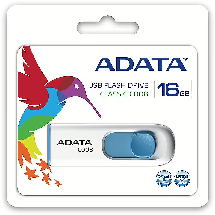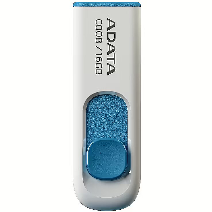 LongSummaryDescription - ADATA C008. Capacity: 16 GB, Device interface: USB Type-A, USB version: 2.0. Form factor: Slide. Weight: 10 g. Product colour: Blue, White
