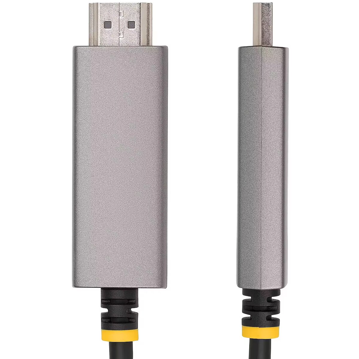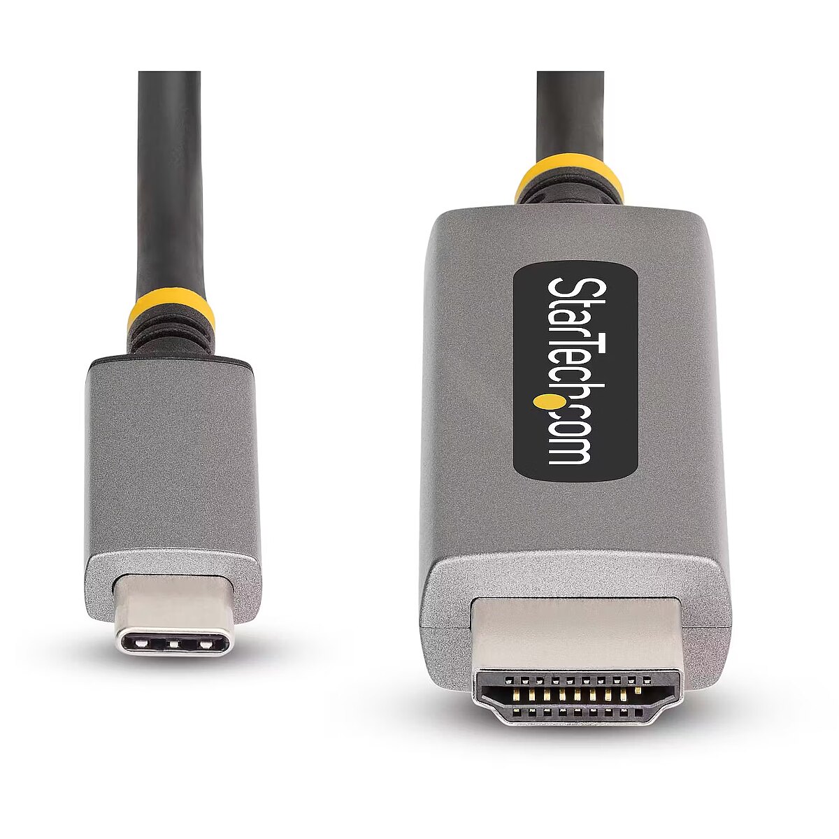 LongDesc - Connect a DP Alt Mode enabled USB-C source to an HDMI monitor, located up to 3.3ft (1m) away, with support for HDR video and resolutions up to 8K 60HzConnect an 8K 60Hz or a 4K 144Hz HDMI display to a DP Alt Mode-enabled USB Type-C source, at a distance of up to 3.3ft (1m), using this USB-C to HDMI Adapter Cable.High-Resolution HDR VideoThis USB-C to HDMI Cable enables resolutions of up to 8K 60Hz and is HDMI 2.1 FRL complaint. It supports HDR10, HDCP 1.x/2.2/2.3, and DSC 1.1/1.2a. The adapter cable supports 7.1 channel audio with Dolby Atmos and DTS:X.Hardware PlatformSingle MonitorDisplayPort Alt ModeIntel 11 th Gen & Later Processors8K 60Hz or 4K 144Hz*DisplayPort 1.4Nvidia RTX3000 and AMD RX6000 or later8K 60Hz or 4K 144HzDisplayPort 1.4Intel 10th Gen & Earlier4K 60HzDisplayPort 1.4Apple M1/M2/M3 + Pro & Max4K 60Hz**DisplayPort 1.4*DSC support required to reach maximum resolution capabilities on Intel 11th Gen or later**Apple MacBook's with M1/M2 silicon can only support up to 4K 60Hz through HDMIUniversal CompatibilityThe USB-C to HDMI Converter Cable is compatible with laptops and devices from various brands such as Dell, HP, Lenovo, Microsoft, and more. It works with all hardware platforms and any operating system. The USB Type-C to HDMI Cable requires no drivers or software and works with USB-C DP Alt Mode, USB4, Thunderbolt 3, and Thunderbolt 4 laptops and devices.Note: Apple M1/M2/M3 devices, including MacBook Pro, can only support up to 4K 60Hz over USB-C DP Alt Mode and cannot achieve 8K 60Hz.Thoughtfully DesignedCombining a video adapter and cable minimizes potential points of failure and signal loss. Adaptive receiver equalization optimizes the input signal and amplifies the output signal to ensure compatibility with high-resolution monitors. The cable is equipped with cage shielding to prevent Electromagnetic Interference (EMI).The StarTech.com Advantage