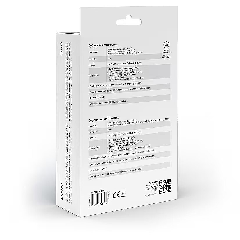Description - DisplayPort 1.4 cable, 3 M, CL-176 DisplayPort 1.4 cable, 3m, CL-176 cable is one of the most modern and versatile solutions for transmitting audio-video signals. This is done between a source device, such as a computer, and a monitor, TV, or other display equipment equipped with a suitable DisplayPort connector. Displaying an image with DisplayPort 1.4 cable, 3 m DisplayPort 1.4 cable, 3 m is commonly used to connect computers to computer monitors. Due to its high bandwidth, it can transmit high-resolution images at a high refresh rate. This allows it to be used in professional and gaming setups. High image quality DisplayPort 1.4 has a bandwidth of up to 32.4 Gbit/s. This means it is possible to transmit images in resolutions up to 8K at 60 Hz (with DSP) and full 4K at 120 Hz in 30-bit color and HDR. What's more, DisplayPort in this variant features support for technologies such as: Display Stream Compression (DSC 1.2), Forward Error Correction (FEC), High Dynamic Range (HDR), FreeSync, G-Sync. Their presence translates into excellent image quality and smoothness in games and multimedia. As a result, you get more realistic images with a greater range of contrast, brightness, and color depth. Ergonomic design DisplayPort 1.4 cable features durable, gold-plated plugs. What's more, despite its design, it is flexible and easy to arrange. It has a cotton braid, which affects the comfort of its use and resistance to abrasion. The package contains a special organizer that makes it easy to arrange or store.
