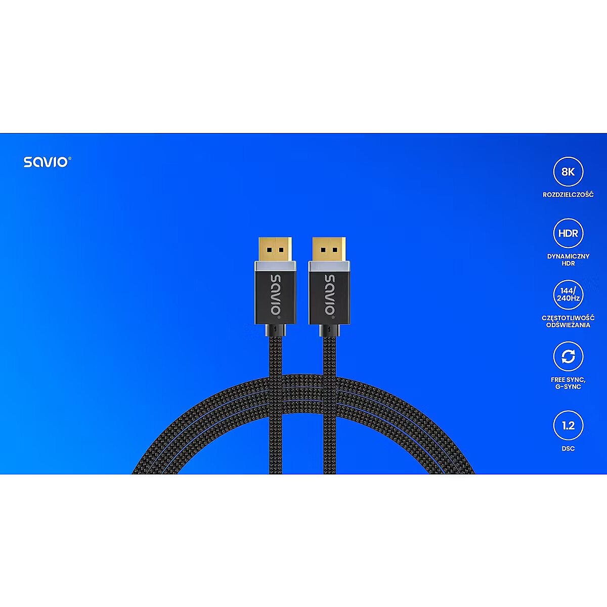 Other features - Version: DP 1.4, bandwidth 32.4 Gbit/s, supports resolutions (with DSC): FullHD @ 240 Hz, 4K @ 144 Hz , 8K @ 60 Hz Length: 3m Connectors: 2 × Display Port, męskie, 24k pozłacane Backwards compatible with DP 1.3, 1.2, 1.1 Bandwith up to 32.4 Gbit/s Display Stream Compression (DSC 1.2) Forward Error Correction (FEC) FreeSync, G-Sync High Dynamic Range (HDR) Protection against external interference - full shielding of signal wires Cable: Cotton braid Packaging for easy cable laying include