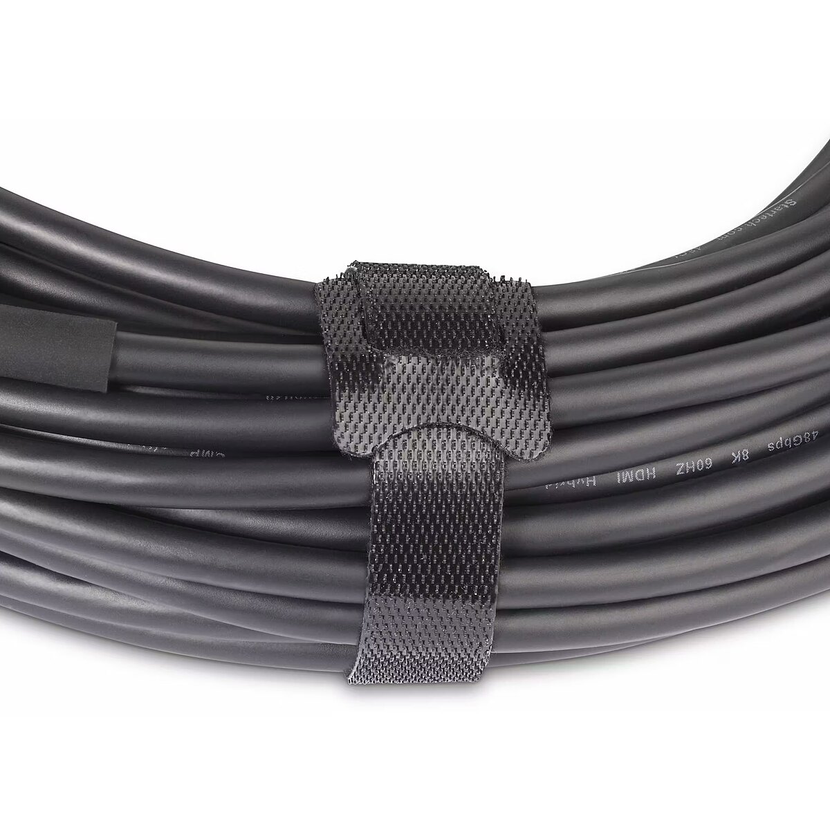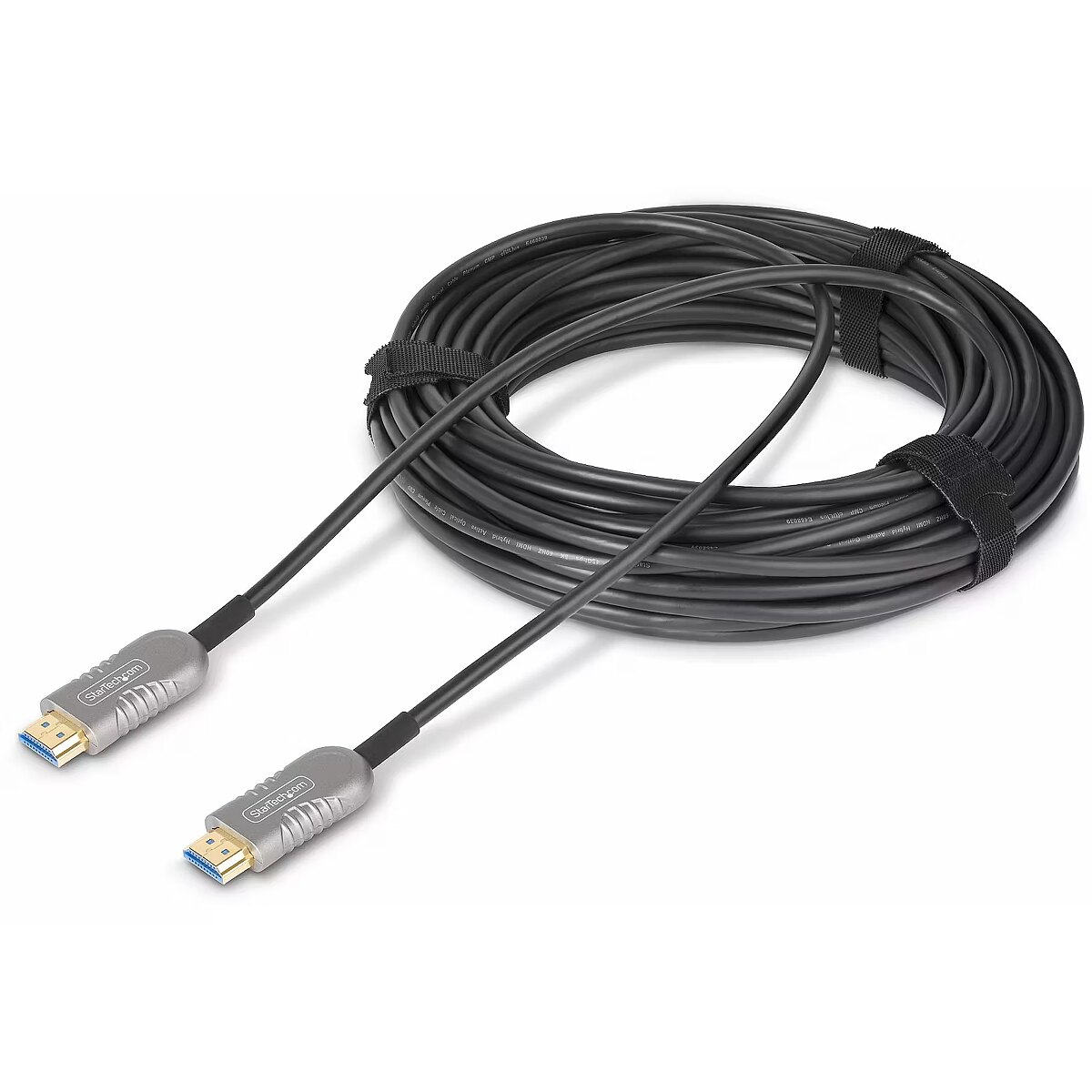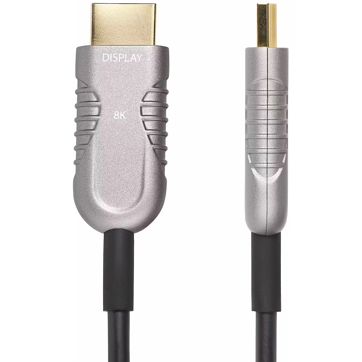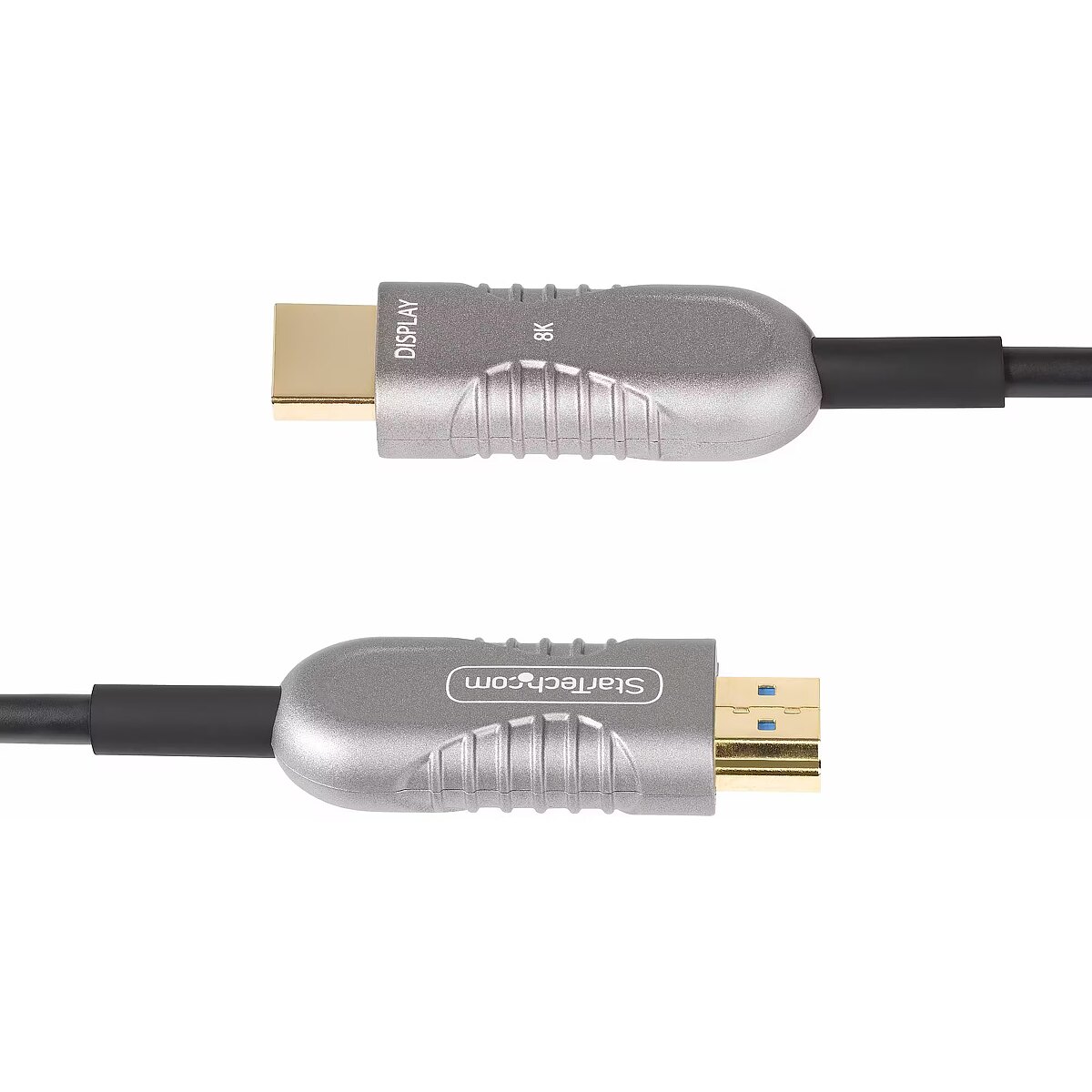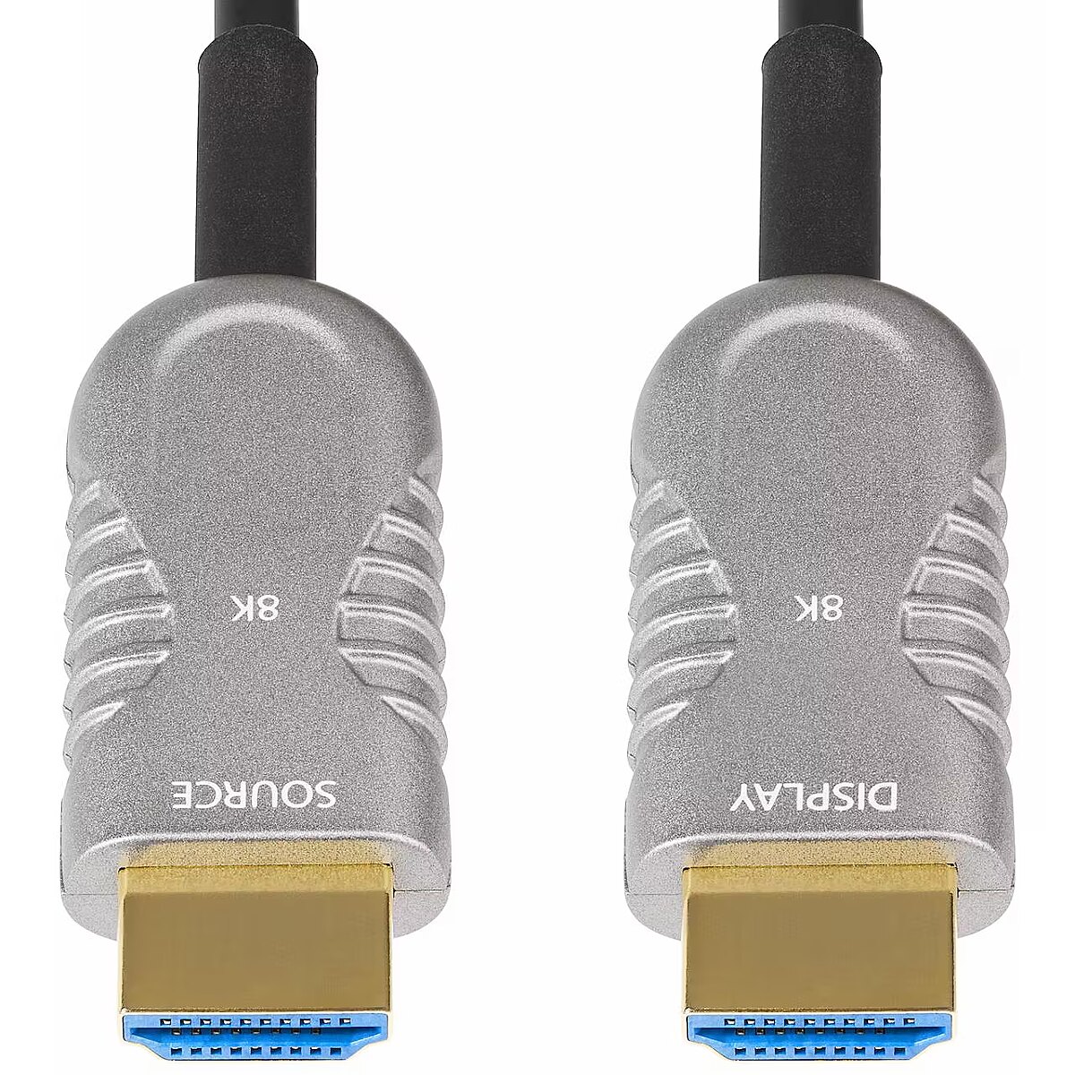 LongDesc - Reliably connect high-bandwidth HDMI 2.1 devices through plenum spacesRoute this Ultra High Speed HDMI 2.1 Hybrid Active Optical Cable (AOC) through office plenum spaces for long distance transmission of 8K 60Hz video and high quality audio.Hybrid AOC ConstructionThe HDMI 2.1 AOC incorporates a hybrid construction consisting of fiber optic cores and copper conductors. This enables the offloading of low-bandwidth signals (EDID/HDCP/eARC) to maintain high-bandwidth transmission of 8K 60Hz video over fiber. The fiber optic inner cores and shielded copper conductors greatly reduce EMI for optimal signal quality across longer distances.Full-Featured HDMI 2.1The 8K HDMI Fiber Optic Cable supports full HDMI 2.1 specifications:• High Bit Rate 3 (HBR3) supports up to 48Gbps bandwidth for higher refresh rates• High Dynamic Range (HDR10+) with 12-bit processing for higher contrast ratio and vibrant, cinematic picture quality• Enhanced Audio Return Channel (eARC) for uncompressed 7.1 and 32-channel audio• Display Stream Compression 1.2a (DSC) for maximum resolution output• Forward Error Correction to manage data transmission errors• High-Bandwidth Digital Content Protection (HDCP 2.3) for a secure connection between source and displayFlexible Plenum-Rated CablingThis Plenum-Rated HDMI 2.1 Cable features a CMP-rated cable jacket with low-smoke and flame characteristics. It is ideal for use in plenum spaces in buildings (e.g., ceilings and in-wall installations). The optical fiber core is reinforced with Aramid strands for tensile strength, and is rated to withstand over 6,000 bending cycles at 120 degrees. This protects the cable from damage when routing through tight spaces requiring multiple bends.The 4.6mm (0.18in) cable outer diameter is flexible and slimmer than typical passive HDMI cables, making it suitable for installation in space-constrained environments.Please Note : This cable is unidirectional and must be installed in a specific direction. Please refer to the SOURCE and DISPLAY labels on the HDMI connectors to ensure that each end corresponds with the correct hardware.The StarTech.com Advantage