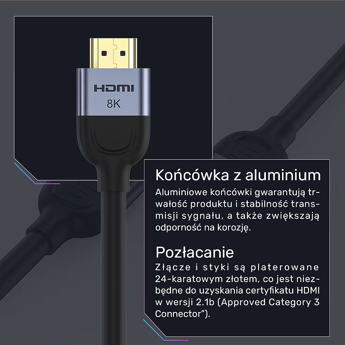 Description - Unitek Kabel HDMI 2.1 8K 60Hz, czarny, 5m Jak wzmocnić doznania z gry na konsoli? Wystarczy połączyć ją z telewizorem za pomocą kabla Unitek C11086GY01! Dzięki jego wysokiej przepustowości, przesył dźwięku i obrazu odbywa się bez opóźnień, co pozwala na szybszą reakcję na wydarzenia w grze. Co więcej, ten kabel HDMI 2.1 jest zgodny z najnowszymi standardami, więc maksymalnie wykorzysta możliwości Twojego telewizora, oferując płynny i ostry obraz w rozdzielczości 8K oraz doskonałą jakość dźwięku przestrzennego! Standard HDMI 2.1 Unitek C11085GY01 to kabel HDMI 2.1 i wstecznie kompatybilny ze starszymi wersjami tego interfejsu. Rozdzielczość 8K przewód może przesyłać obraz w jakości 8K@60Hz, 4k@120Hz, 2k@144Hz. Super jakość dźwięku kabel obsługuje DTS-HD i Dolby Audio co przekłada się na niezapomniane doznania dźwiękowe. Dynamiczny HDR dzięki obsłudze dynamicznego HDR kolory na ekranie staną się żywsze niż kiedykolwiek. VRR dzięki tej technologii zapomnisz o irytującym klatkowaniu i lagach podczas grania na konsoli. Przepustowość 48 Gbps dzięki tak wysokiej prędkości transferu danych, kabel ten może przesyłać obraz i dźwięk w super jakości bez jakichkolwiek odczuwalnych opóźnień. Wybitna jakość wykonania kabel jest wyprodukowany na bazie trwałych materiałów i będzie Ci służył przez długie lata. Obraz realistyczny bardziej niż kiedykolwiek wcześniej Odkryj na nowo ulubione filmy i poczuj się jak na trybunie stadionu sportowego w trakcie mundialowych rozgrywek zobacz, jak realistycznie prezentuje się obraz w rozdzielczości 8K (8192x4320 px) i przy odświeżaniu na poziomie 60 Hz. Sygnał wideo w tak wysokiej rozdzielczości są w stanie przesyłać wyłącznie kable HDMI spełniające najwyższe standardy jakościowe. Kabel HDMI 8K Unitek obsługuje dynamiczny HDR technologię, dzięki której kolory nabierają niespotykanej wcześniej głębi. Poznaj maksimum możliwości Twojego telewizora, projektora lub monitora i połącz go z dekoderem, lub komputerem przy użyciu kabla Unitek C11086GY01. Zanurz się w otchłani dźwięku Obsługa standardów DTS-HD i Dolby Audio przekłada się na wybitną jakość sygnału audio przesyłanego tym kablem. Wybitnej jakości obraz i doskonałej jakości dźwięk przestrzenny oto mieszanka, która jest gwarantem wyśmienitej rozrywki w grach, przy oglądaniu filmów czy np. koncertów. Teraz usłyszysz każdy detal głosu Twojej ulubionej wokalistki, każdą łuskę opadającą za Twoimi plecami i potwora, który skrada się tuż za rogiem w Twojej ulubionej grze! Wynieś cyfrową rozrywkę na jeszcze wyższy poziom Przepustowość do 48 Gbps, odświeżanie 120Hz przy rozdzielczości 4K i 60Hz w rozdzielczości 8K te dane z pewnością doceni każdy amator grania na konsoli. Dzięki tak wysokiej przepustowości obraz jest przesyłany bez jakichkolwiek odczuwalnych opóźnień, a nawet najbardziej dynamiczne sceny są wyświetlane płynnie dzięki wysokiej częstotliwości odświeżania. Dodatkowo kabel HDMI 2.1 obsługuje technologię VRR, która odpowiada za dostosowywanie liczby klatek w czasie rzeczywistym w efekcie zapomnisz o klatkowaniu czy zacinaniu się obrazu w grach. Prawdopodobnie jest to obecnie najlepszy kabel do ps5, kabel do Xbox One oraz starszych generacji tychże konsol. Jakość gwarantowana Unitek jest pewien jakości swoich produktów, dlatego wszystkie urządzenia w Polsce są objęte dożywotnią gwarancją dystrybutora. Oznacza to, że w przypadku ewentualnych problemów technicznych, możesz odesłać sprzęt do serwisu za pomocą pobliskiego paczkomatu. Odwiedź lokalną stronę marki Unitek, żeby dowiedzieć się więcej lub uzyskać pomoc techniczną. kabel HDMI 2.1, jakość obrazu: 8K@60 Hz, 4K@120 Hz, 2k@144Hz. dźwięk Dolby Audio, DTS-HD przepustowość: 48 Gbps, długość: 5m obsługa: HDR10, ARC, ALLM, QFT, QMS, VRR, BT.2020, 4:4:4 RGB, HDCP 2.2/ 2.3.