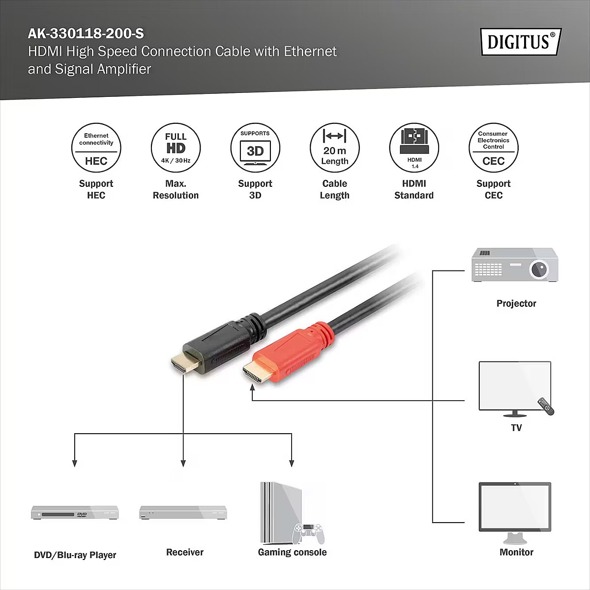 Name - DIGITUS HDMI Anschlusskabel Ethernet,Verstärker,20m,schwarz