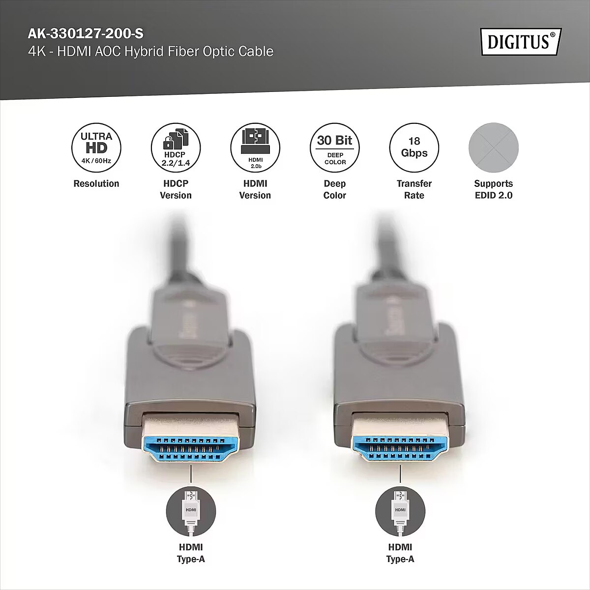 Name - Digitus HDMI / Micro HDMI AOC Hybrid Fiber Optic Cable, UHD 4K Black, 20 Meters, Detachable Connectors