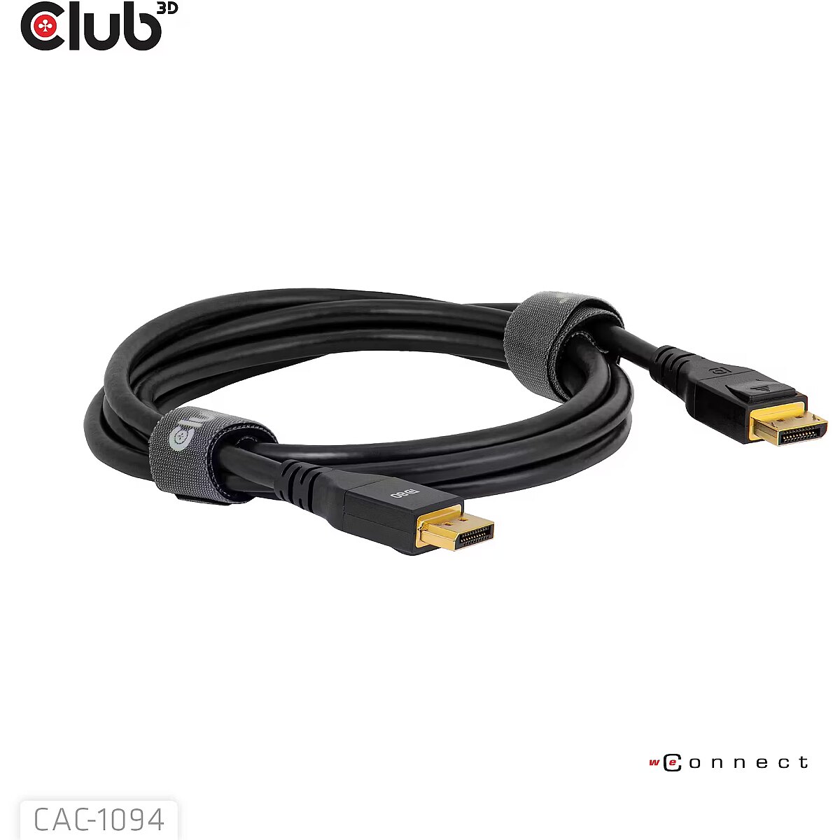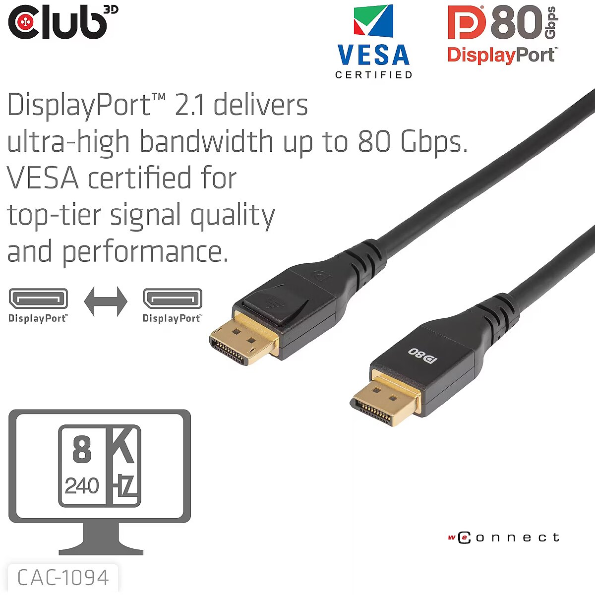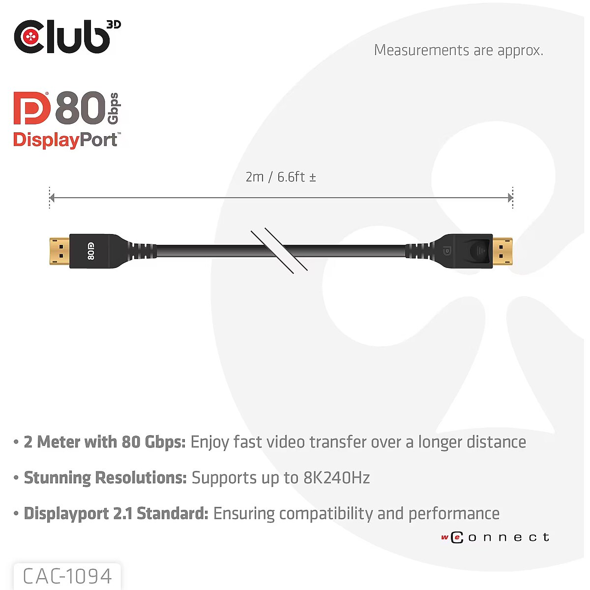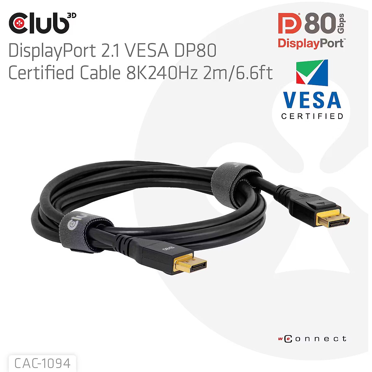 LongDesc - The Club 3D CAC-1094 DisplayPort™ 2.1 Cable enables the connection of your DisplayPort™ supported (Gaming) PC or Laptop to an (Ultra) High Resolution Monitor or other DisplayPort™ supported device. DisplayPort™ 2.1 UHBR10/13.5/20 up till 80 Gbps, also has support for Display Stream Compression 1.2 (DSC), Forward Error Correction, and extends the maximum number of inline audio channels to 32.Thanks to improvements in both the DisplayPort™ connector and cable design, the new VESA certified DP80 UHBR cables enable consumers to get the highest performance possible from their VESA certified devices. These new cables are backed by VESA’s UHBR Certification Program, which provides added assurance that if your cable has the DP40 or DP80 logo from VESA, it will meet the specs for the highest data rates supported by current and future products certified by VESA. • EXCEPTIONAL CABLE LENGTH: This is the first DP80 cable to reach two metres.• HIGH PERFORMANCE: The DP80 is the top-tier version of the DisplayPort™ 2.1 standard. It can support a video signal of up to 8K60Hz with HDR without compression. With DSC enabled, the frequency can be increased to 8K240Hz.• VESA CERTIFIED: This ensures that the highest standards are met in terms of both physical and electrical quality in a 26 AWG cable.• QUALITY CONSTRUCTION: Nickel-plated connectors with PVC strain reliefs for durability; Twisted Pair wire with braided alloy shield for enhanced EMI protection.