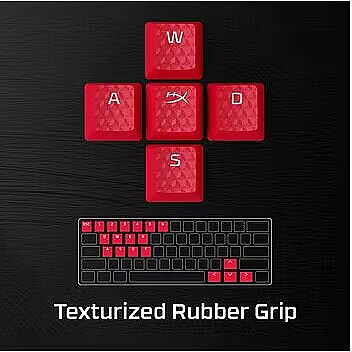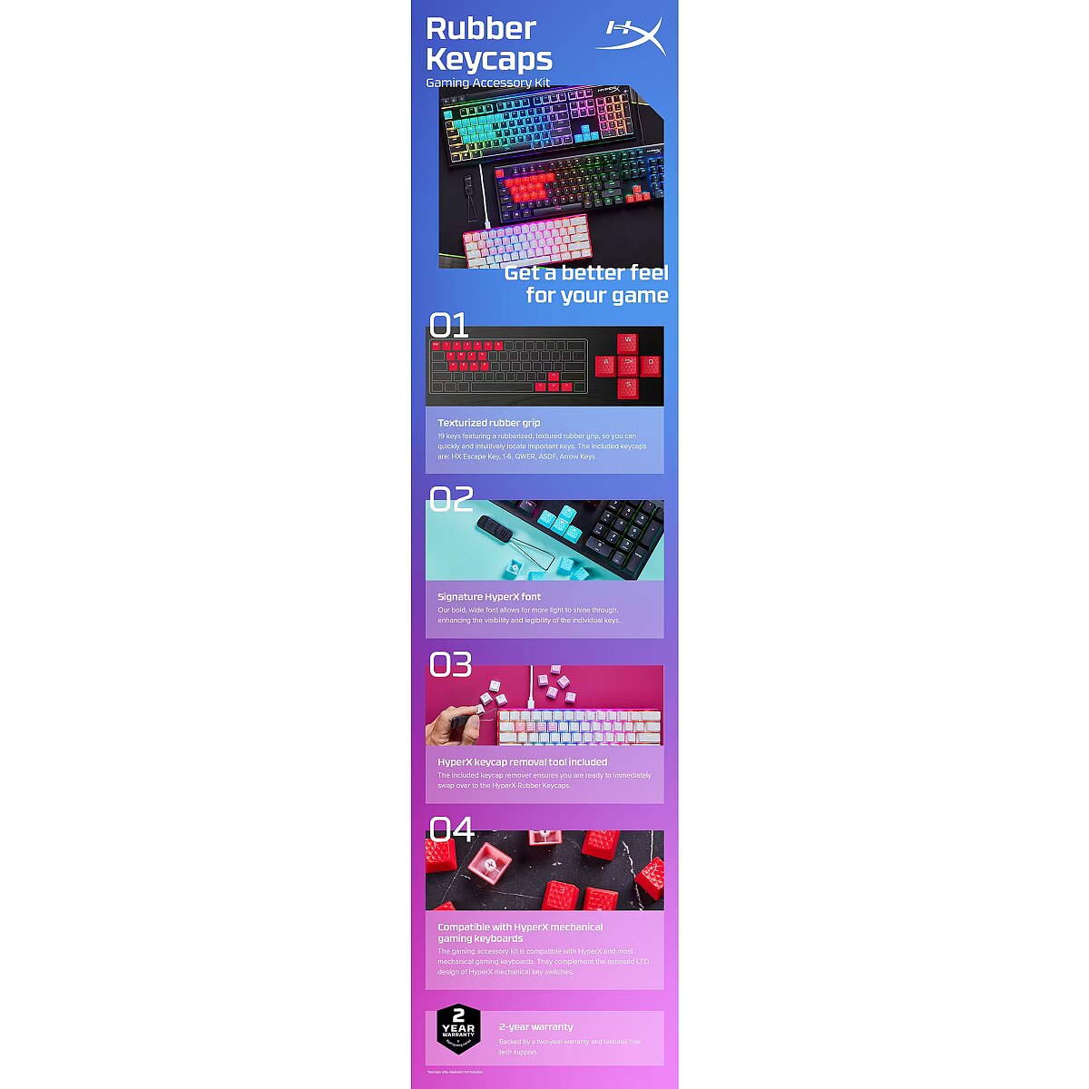 LongDesc - Get a better feel for your game.Install a set of HyperX Rubber Keycaps and get a better feel for your keyboard. This accessory kit is a set of 19 rubberized, textured keycaps that provides a different tactile feel for the most important keys for your favorite games, so you’ll intuitively know you’re on the right keys. They’re available in 3 different colors and fit HyperX mechanical keyboards, as well as most other mechanical key switches. HyperX Rubber Keycaps feature a bold, wide font designed to let light shine through, and come with an included keycap removal tool.