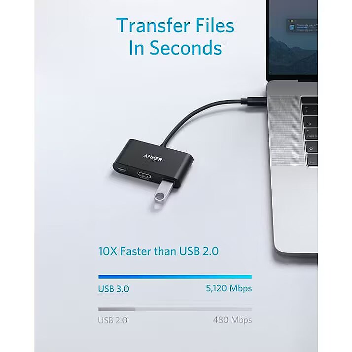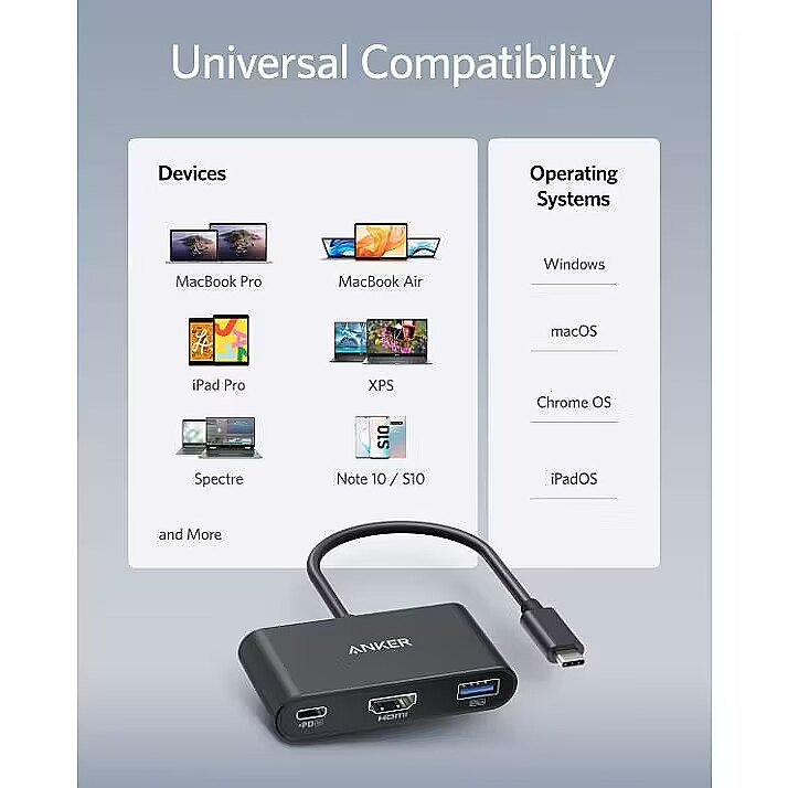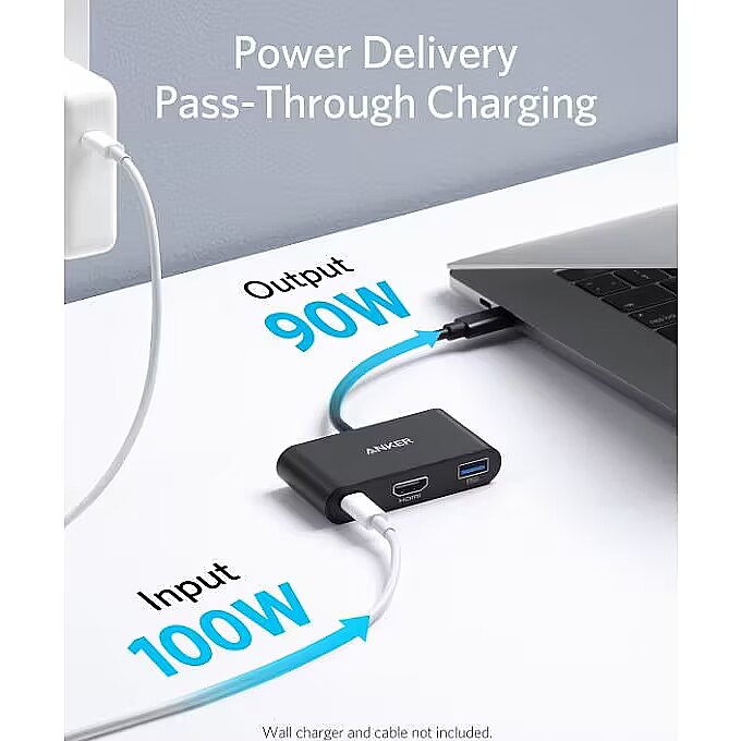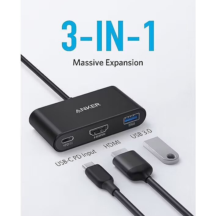 LongDesc - PowerExpand 3-in-1 USB-C PD HubThe 3-in-1 Ultra-Compact USB-C HubGet More From Your LaptopTransform just one USB-C port into an HDMI port for media display, a USB-A data port for file transfer, and a Power Delivery input port for pass-through charging.Power Delivery Pass-Through ChargingConnect a USB-C charger (sold separately) to the Power Delivery input port to charge your laptop while using the hub’s other functions.4K Media DisplayExtend or mirror your display in up to 4K@30Hz via the HDMI port.Transfer Files at High SpeedMove photos, music, and movies between devices at speeds of up to 5 Gbps.Compatible Devices:MacBook Pro 2021 / 2020 / 2019 / 2018 / 2017 / 2016, iPad Pro, MacBook Air (USB-C), Dell XPS 13/15, Thinkpad X1, Lenovo Yoga 14, HP Spectre X360, Microsoft Surface Pro 7, Google PixelBookIncompatible Devices:- Nintendo Switch- Apple USB SuperDriveNotes:- The USB-A data port does not support charging.- Charger and cable not included.Key Features- The Anker AdvantageJoin the 65 million+ powered by our leading technology.- Increase Your Port OptionsTurn your laptop’s USB-C port into a Power Delivery input port, an HDMI port, and a USB-A data port.Powerful Pass-Through ChargingConnect a Power Delivery charger to provide up to 90W charging for your laptop.- High-Speed, High-DefThe USB-A data port provides file transfer at speeds up to 5 Gbps, while the HDMI port supports media display at resolutions up to 4K@30Hz.- What You GetPowerExpand 3-in-1 USB-C PD Hub, welcome guide, our worry-free 18-month warranty, and friendly customer service.