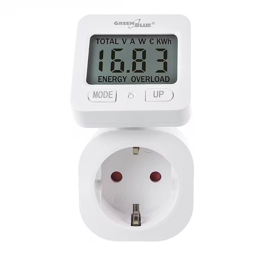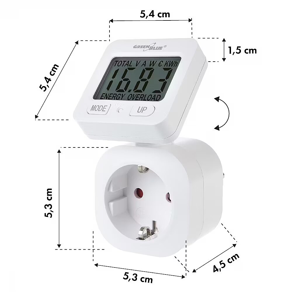 Description - The electricity meter allows you to see which devices are operating uneconomically - so you can implement a savings plan and reduce your electricity expenses. Check how much energy your computer, TV, washing machine are using.... This is an indispensable tool for anyone who wants to monitor energy consumption in their home or office. Less power consumption means less CO2 emissions into the environment. The device measures the energy consumed (and calculates its cost) of home appliances, so you can see which ones consume the most power and thus reduce their use. Thus reducing electricity bills. The meter is equipped with 2 convenient buttons for easy operation of the device. With a maximum power of 3680W, it can handle even the most demanding electrical appliances. The clear display allows you to easily read data such as the amount of energy consumed and its cost. This allows you to accurately monitor and control your electricity expenses. Additionally, the display can be rotated, allowing you to adjust the viewing angle for the best visibility. . Manufacturer: GreenBlue Model: GB615 F Socket type: F (schuko) - used, among others, in Germany Max load: 3680 W Power supply: 220-240 V / 50-60Hz, 16 A Voltage measurement range: 200 V - 276 V (accuracy +/- 2%) Current measurement range 0.00 - 20 A (accuracy +/- 2%) Power display range: 0.3 - 3680 W (accuracy +/- 2%) Consumption range: 0 - 9999 kWh Meter dimensions: 5.3 x 5.3 cm Display dimensions: 5.4 x 5.4 cm Degree of protection: IP20 Operating temperature range: -10° to +40°C Operating humidity range: 30 - 80% Child protection Color: white