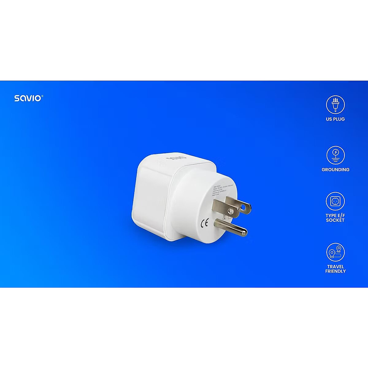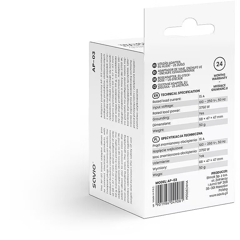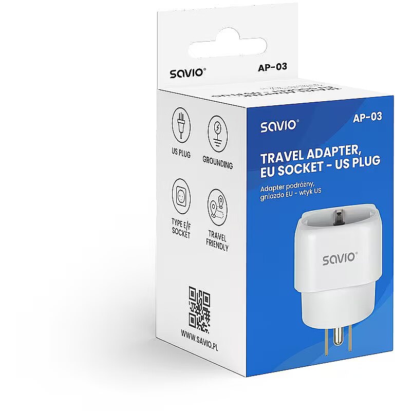Description - Travel adapter, EU socket - US plug AP-03 The SAVIO AP-03 adapter is a highly practical electronic gadget which enables you to connect devices with an EU plug to US sockets without any problems. With a weight of 50 g and dimensions of 68 x 47 x 47 mm, the adapter is convenient to carry, and the built-in earthing guarantees a stable connection and safety when using the device. Ultralight, robust and compact design Adaptation of European plugs to American (US) sockets Safety and protection for your devices Why choose a Savio travel adapter? The AP-03 adapter allows you to use European electronic devices in the USA and other countries with an American socket system; Its small size and robustness make it the perfect companion for any journey; The electronic gadget is small in size, lightweight and powerful, making it an excellent choice for those who travel between continents; Designed to connect with hybrid plugs (unischuko) or Europlug; Savio brand travel adapter is suitable for input voltages from 100V - 250V Configurators Country of origin: Poland, Afghanistan, Albania, Algeria, Andorra, Armenia, Aruba, Austria, Azerbaijan, Bhutan, Bosnia and Herzegovina, Bulgaria, Cape Verde, Chad, Croatia, Egypt, Estonia, Ethiopia, Faroe Islands, Finland, Georgia, Greece, Greenland, Guinea, Hungary, Iceland, Indonesia, Iran, Italy, Jordan, Kazakhstan, Kyrgyzstan, Laos, Latvia, Liberia, Lithuania, Luxembourg, Macau, Northern Macedonia, Moldova, Monaco, Mozambique, Myanmar (Burma), Netherlands, Netherlands Antilles, New Caledonia, Germany, Niger, Norway, Paraguay, Portugal, Romania, Russia, Saudi Arabia, Serbia, Montenegro, Slovenia, South Korea, Spain, Suriname, Sweden, Tajikistan, Thailand, East Timor, Turkey, Turkmenistan, Ukraine, Uruguay, Uzbekistan, Belarus. Destination country: American Samoa, Anguilla, Antigua and Barbuda, Aruba, Bahamas, Barbados, Belize, Bermuda, Bolivia, British Virgin Islands, Cambodia, Canada, Cayman Islands, China, Colombia, Costa Rica, Cuba, Dominican Republic, Ecuador, El Salvador, Guam, Guatemala, Guyana, Haiti, Honduras, Jamaica, Japan, Democratic People's Republic of Korea, Lao People's Democratic Republic, Lebanon, Liberia, Malaysia, Maldives, Mexico, Micronesia, Federated States, Montserrat, Netherlands Antilles, Nicaragua, Niger, Palau, Panama, Peru, Philippines, Rep, Puerto Rico, Saint Kitts and Nevis, Saint Vincent and the Grenadines, Taiwan, Thailand, Trinidad and Tobago, Turks and Caicos Islands, US Virgin Islands, United States of America/USA, Venezuela, Vietnam, Yemen