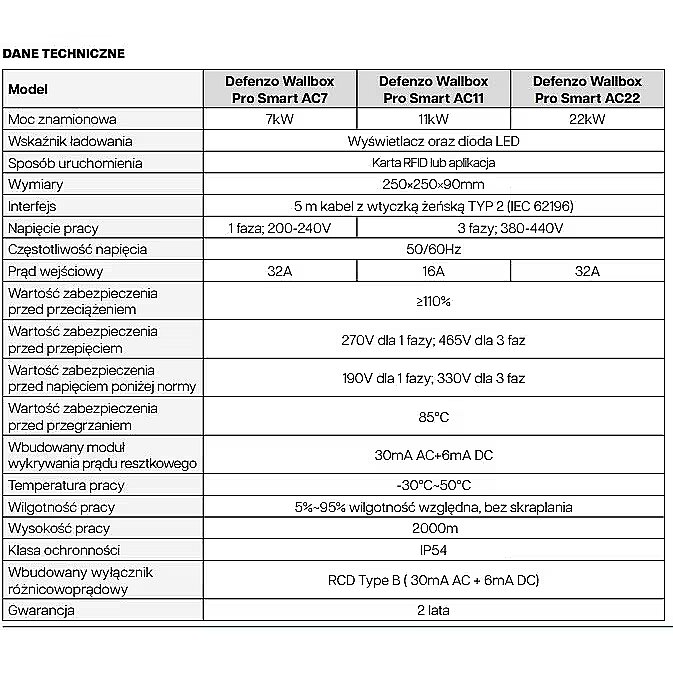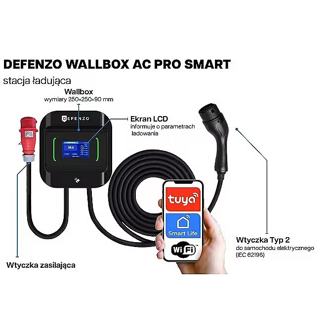 Description - Defenzo Wallbox AC Pro Smart Nowoczesna stacja ładowania do użytku domowego i półpublicznego Nowoczesna stacja ładowania do użytku domowego i półpublicznego idealna do garaży, miejsc postojowych wspólnot mieszkaniowych czy firmowych parkingów. Dzięki mocy 22 kW i inteligentnemu sterowaniu, Defenzo Wallbox AC22 Pro Smart umożliwia szybkie i bezpieczne ładowanie samochodów elektrycznych z wykorzystaniem prądu przemiennego AC. Czarna, elegancka obudowa o nowoczesnym wyglądzie została wyposażona w kolorowy ekran LCD, który prezentuje najważniejsze parametry ładowania: aktualny prąd, napięcie, czas sesji czy zużycie energii. Dodatkowo status urządzenia sygnalizowany jest za pomocą kolorowego podświetlenia LED wokół ekranu oraz świecącego logo Defenzo. Ładowarka wyposażona jest w kabel zakończony złączem Type 2 (IEC 62196) oraz czerwony wtyk siłowy CEE, który pozwala na szybkie podłączenie do istniejącej instalacji trójfazowej. Inteligentne funkcje: Sterowanie przez aplikację mobilną (Tuya/Smart Life): zdalny start/stop, ustawienia harmonogramu, zmiana mocy ładowania, historia sesji. Czytnik RFID możliwość nadawania dostępu do ładowania tylko wybranym użytkownikom (np. na parkingu wspólnoty). Funkcja opóźnienia ładowania i przycisk zmiany natężenia prądu bezpośrednio na urządzeniu. Bezpieczeństwo i niezawodność: Wbudowany wyłącznik różnicowoprądowy RCD typu B (30 mA AC + 6 mA DC) oraz komplet zabezpieczeń chronią urządzenie i użytkownika przed: przepięciami i spadkami napięcia przeciążeniem i przegrzaniem prądami upływowymi i brakiem uziemienia uszkodzeniami mechanicznymi i wilgocią (klasa ochrony IP54)