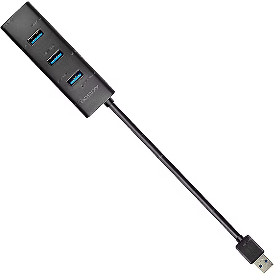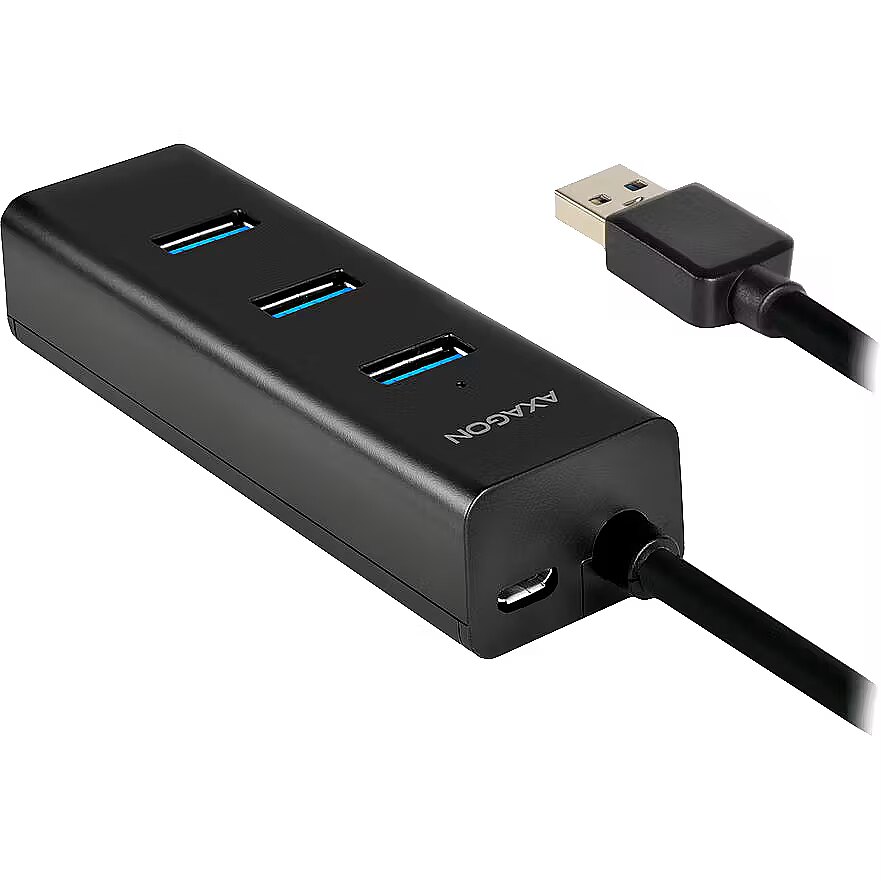 MINI & LIGHTWEIGHT • MATTE SURFACE • FIXED USB CABLEThe four port AXAGON HUE-S2B USB 3.0 hub with optional external power and fast charging support on all ports.A lightweight small hub with elegant, matte plastic body connects quickly and easily up to four USB devices to your PC at one time.A great advantage is the possibility of external power supply from any mobile device charger with a micro USB connector. The unused charger thus makes this USB hub a fast-charging hub for free.Mobile phones, tablets, power banks and other devices can be charged up to 2A (depends on the charger used) in any hub port thanks to the USB Battery Charging 1.2 support.Supports charging of iPad tablets even without auxiliary power supply with approx. 1A (iPad mostly cannot be charged directly from the USB 3.0 ports on the PC).It can even handle permanent connection of several external disks without external hub power. When external power supply is connected, you can even work with three external disks at one time.The USB ports located across the hub body with sufficient spacing ensure seamless direct connection of large USB devices.A permanently attached USB cable with a sufficient length of 30 cm is ideal for use with laptops.It can also work as a separate charging hub and charge the USB devices from the power adapter even when the PC is turned off or disconnected.Features: