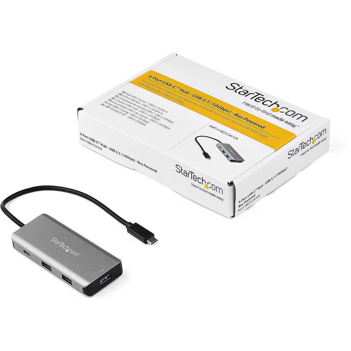 ShortSummaryDescription - StarTech.com 4 Port USB C Hub w/ 3x USB A & 1x USB C - SuperSpeed 10Gbps USB Type-C 3.1/3.2 Gen 2 Hub - USB Bus Powered - Compact USB-C to USB Adapter Hub - Portable/Laptop Hub - Aluminum~4 Port USB C Hub w/ 3x USB A & 1x USB C - SuperSpeed 10Gbps USB Type-C 3.2 Gen 2 Hub - USB Bus Powered - Compact USB-C to USB Adapter Hub - Portable/Laptop Hub - Aluminum, USB 3.2 Gen 2 (3.1 Gen 2) Type-C, USB 3.2 Gen 2 (3.1 Gen 2) Type-A, USB 3.2 Gen 2 (3.1 Gen 2) Type-C, 10000 Mbit/s, Black, Grey, Aluminium, Plastic, 0.25 m