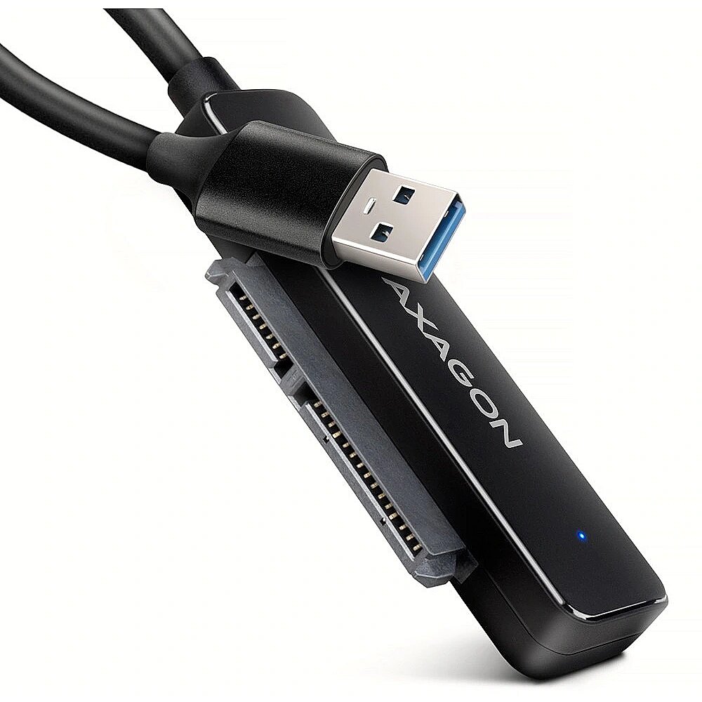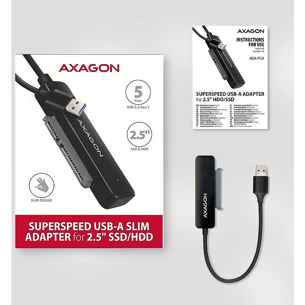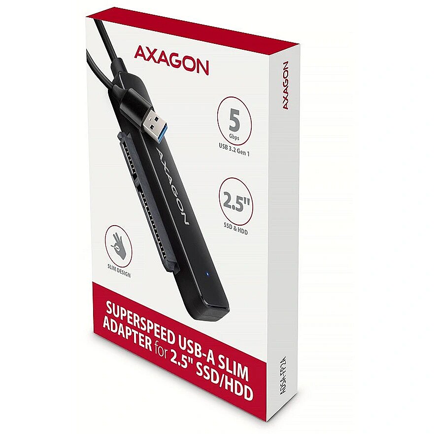 Description - Compact AXAGON ADSA-FP2A SLIM adapter with USB-A 5Gbps and SATA 6G interface for 2.5" SATA hard drives or SSDs. The connection to the computer enables a permanently attached USB-A cable 20 cm long. Thanks to the USB 3.2 Gen 1 interface, the transfer rate is up to 5 Gb/s, and the Plug & Play function ensures automatic connection to the computer.  The adapter also supports all important functions for working seamlessly with different types of drives. Such as UASP for faster data transfer, TRIM for limiting the gradual degradation of SSD performance over time, S.M.A.R.T. for monitoring the status of the drives, BOOT for the ability to boot from drives connected to the adapter, Auto Spindown to automatically put drives to sleep during prolonged inactivity, Turn Off to shut down the drives after removing the device or putting the PC to sleep, and USB Bus Power to power the adapter including connected drives only from the USB port. The slim and compact adapter enables easy and quick disc replacement without the need for assembly, and at the same time, thanks to its minimal dimensions, it can be readily at hand at any time. The matte design of the cover prevents unwanted fingerprints. These features make the adapter a very handy and useful tool for frequent work with different types of drives. This makes it an ideal tool for backup, migration, data transfer, storage and recovery, discs testing, etc. Input: