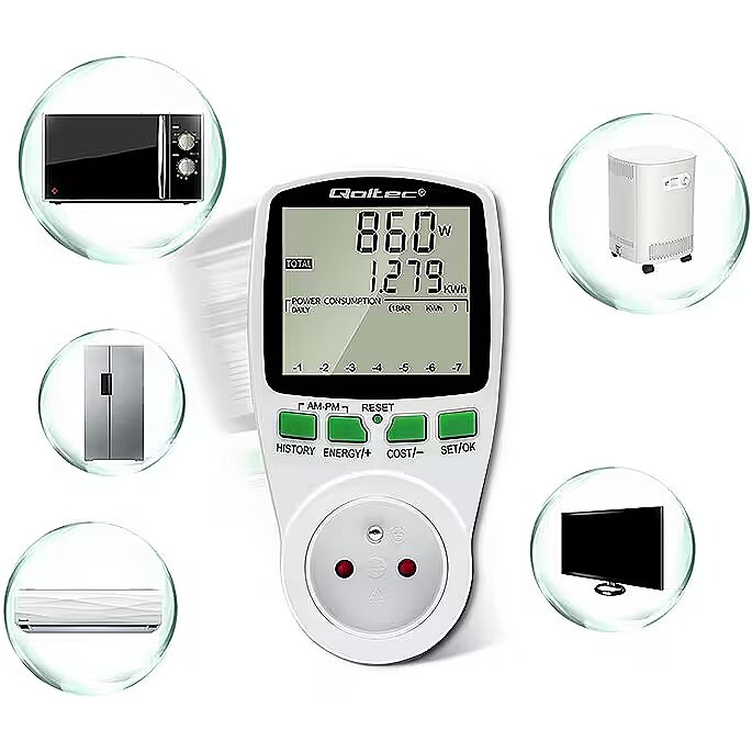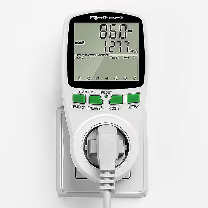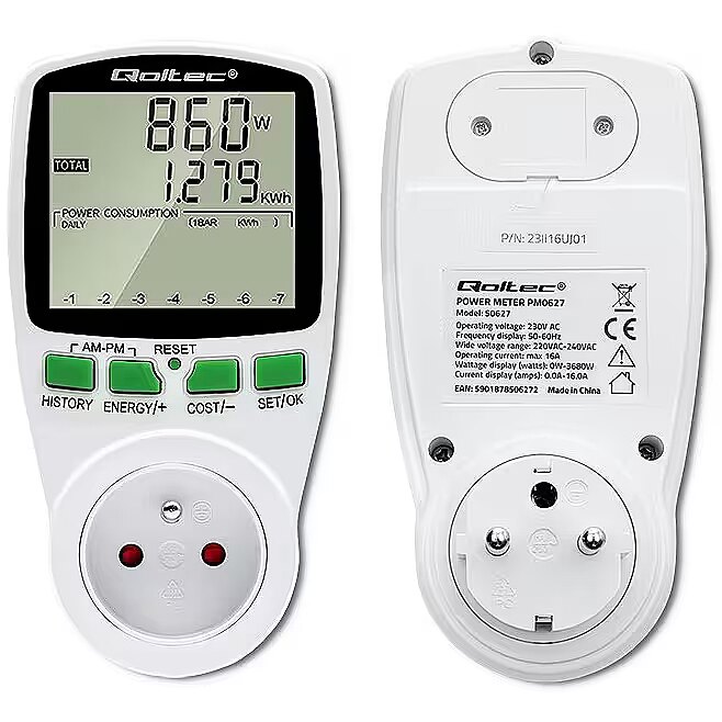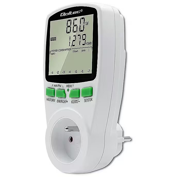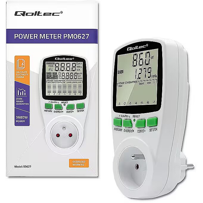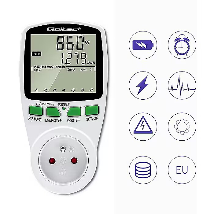 Kirjeldus - Säästke juba täna oma arvetel – jälgige oma kodu energiatarbimist Elektrooniline energiamõõtur on kindlasti kasulik igas kodus. Jälgige ja haldage oma energiatõhusust juba täna. See väike, intelligentne ja lihtne kasutada seade võimaldab teil kergesti tuvastada kõige kulukamad seadmed. Ühendage lihtsalt valitud seade mõõturiga, et näha, kui palju energiat selle tööks vaja on ja millised on sellega seotud kulud. Sel viisil saame kõrvaldada seadmed, mis on nn energiasööjad, ja säästa raha, aidates samal ajal kaasa energia tõhusale kasutamisele. Mõõteparameetrite täpne lugemine Qoltec energiatarbimise arvesti abil saate täpseid lugemeid, mitte hinnanguid, nii et saate täpselt arvutada tarbitud elektrienergia maksumuse ja kontrollida kasutatavate säästumeetodite tõhusust.