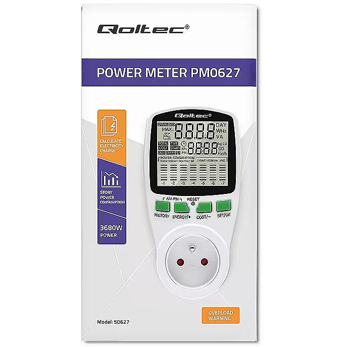 Using the Qoltec power consumption meter, you gain precise readings, not estimates, so you are able to accurately calculate the cost of the electricity consumed and check the effectiveness of the saving methods you are using.