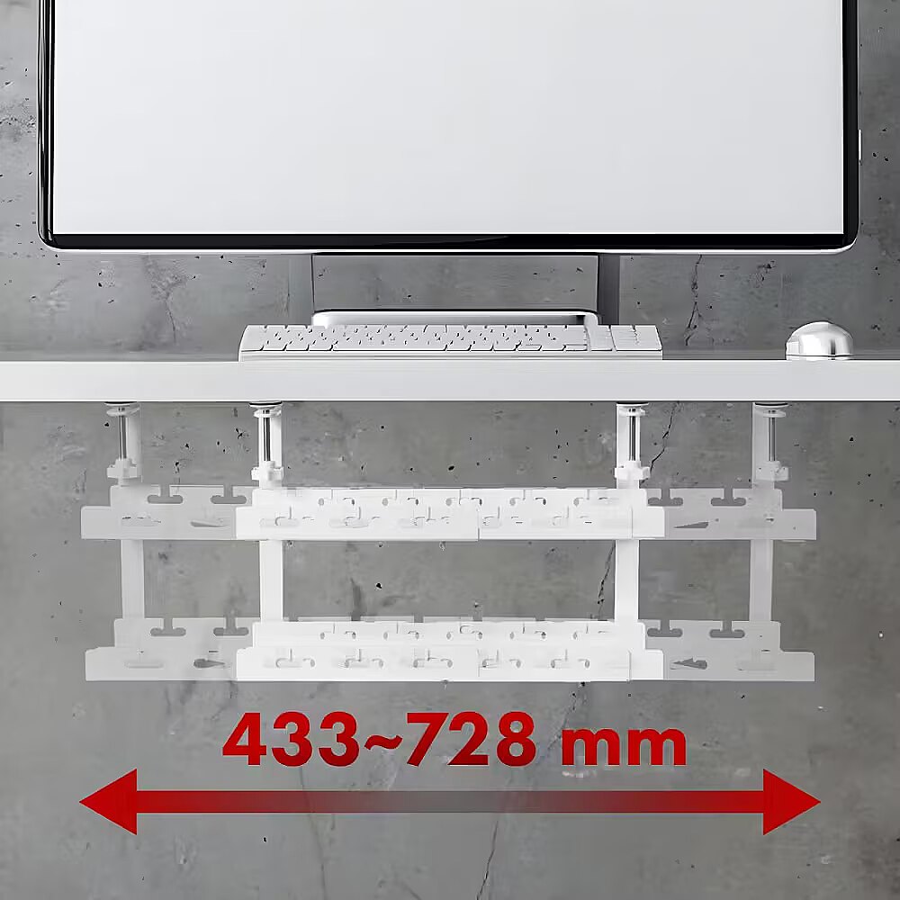 Description - Pull-out strip cable organizer 2 levels Maclean under-desk cable organizer, max. load 5kg, max. 728mm, 2 levels, white, MC-102 W The two-tier under-desk mounted cable strip organizer is the ideal solution for those who need more space to organize their cables and power equipment. With an adjustable length from 433 to 728 mm, you can easily adjust it to fit different countertop sizes and strip lengths. Two levels of brackets allow you to mount two power strips or additional devices such as power supplies, USB hubs or routers at the same time. The clamp-on mounting system makes installation quick and non-invasive - no drilling or disturbing the surface of your furniture is required. The organizer features pass-through holes that allow cables to be conveniently routed between levels and in different directions. The sturdy construction ensures durability, and the modern, minimalist design blends well with office and home spaces. The Macean MC-102 is a functional, aesthetically pleasing and flexible solution that will help keep things tidy, improve work ergonomics and facilitate the daily use of electronic devices.
