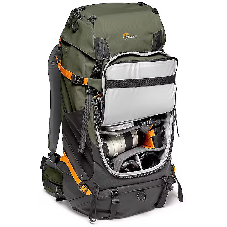 description_en - Essential photographers backcountry camera backpack for multi-day hiking Fits CSC/DSLR with grip, 70-200/2.8 attached & 2 extra lenses Extra lightweight & made with 86% recycled fabric Easy front and back access to removable GearUp camera insert Features Small/Medium shoulder straps and ActivLift™ harness Keep hydrated with a 3-litre dedicated hydration pocket The new Lowepro PhotoSport PRO Backpack is built for professional photographers who need a lightweight, comfortable bag that perfectly suits their gear and use during a multi-day photography mission in the backcountry. Our backcountry camera backpack has been designed to protect photo gear with the integrated and removable GearUp PRO XL camera insert, plus the dedicated accessory strap system allowing multiple carrying configurations. Provides enough storage space for multi-day hiking essentials, such as sleeping bag, tent, camp meal, jacket, trekking poles, hydration reservoir and water bottle, etc. Hike in comfort for the long haul with the ActivLift™ harness system with torso length adjustment – built to provide a comfortable fit and weight distribution for optimal outdoor exploration. Built rugged and made of 86% recycled fabric and it includes All Weather AW Cover™ to protect gear from rain, snow and dust. Fits Pro DSLR or Pro Mirrorless body with 70-200mm f/2.8 lens attached 1-2 extra lenses 3-litre hydration reservoir (not included) Large tripod