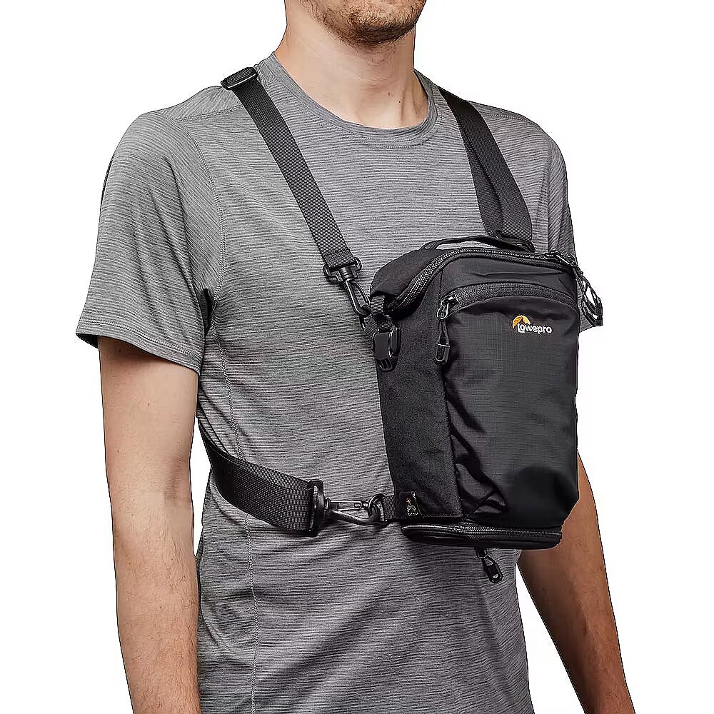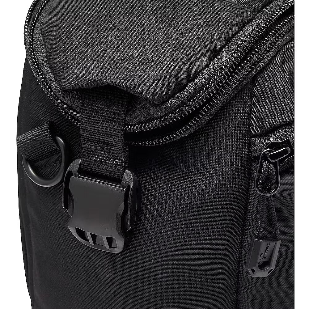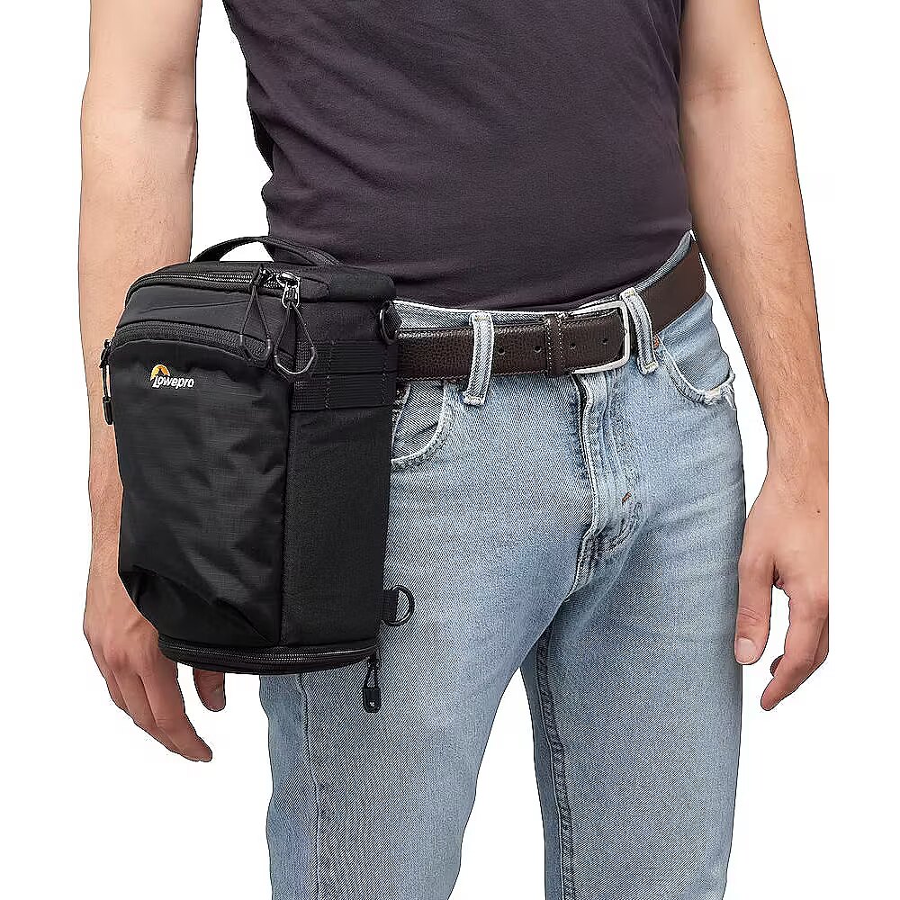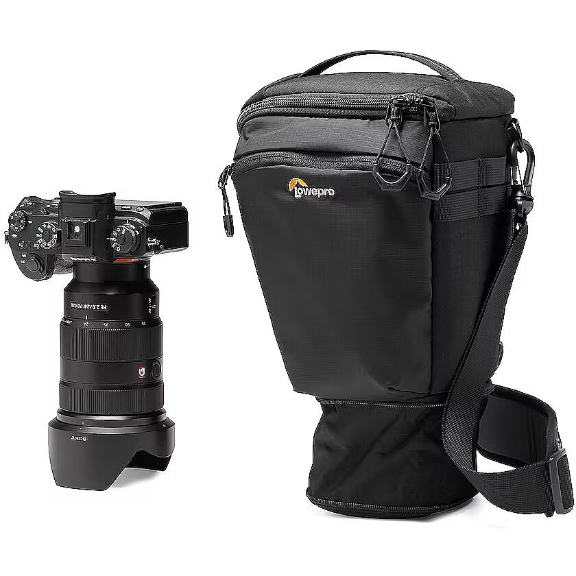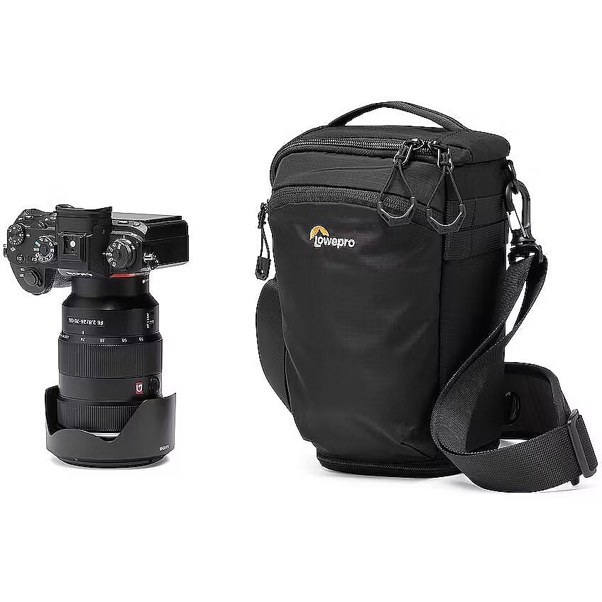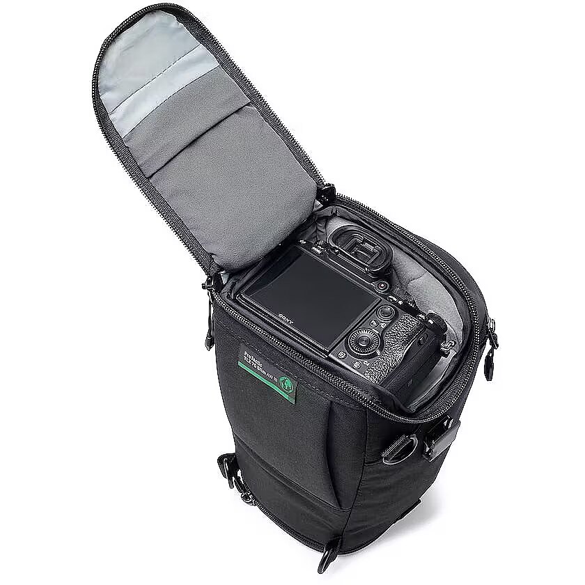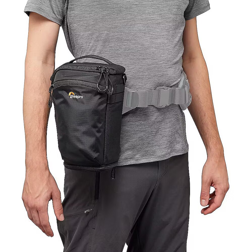 The ProTactic TLZ 70 Slim III is designed for the working photographer shooting events and other jobs all day, largely outdoors. This toploader is sized for a full-frame body without a portrait grip and up to a 24-70 f2.8 lens attached. The bag features an expansion section to accommodate a lens hood in shooting position, and the door wraps to the side for easier grip access. The quick-close buckle allows for fast access, while the interior divider holds the camera near the top for easy removal or divides the bag for a two-lens kit. Versatile Carry Options