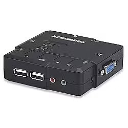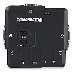 LongDesc - The Manhattan KVM Switch is a two-port compact KVM switch with audio and mic switching functionality. Its USB support on the console side allows you to use a USB keyboard and mouse. It comes with two sets of detachable USB KVM combo cables and two sets of audio/mic cables for SOHO and office desktop multimedia applications. And it allows you to access, control, boot and reboot two USB-enabled multimedia computers with only one USB keyboard, mouse, monitor and optional speaker set and a microphone._x000D__x000D_Audio and Microphone Switching Offers Uninterrupted Multimedia Experience_x000D_The audio and microphone switching function of this KVM Switch allows you to leverage the multimedia systems on each of your two computers. You can monitor the audio/mic input/output of each computer without plugging on and off the audio/mic cables. Users can also choose to use either independent/simultaneous switching of both PC channel and audio/microphone channel for their maximum convenience. And it takes only one set of speakers and microphone instead of one set for each computer. Furthermore, it offers you user-programmable simultaneous/independent PC and audio/mic switching functionality for flexible multimedia and KVM switching operation._x000D__x000D_USB interface Compatibility for Multiplatform Support_x000D_The USB interface technology offers multiplatform support for PC, Macintosh G3/G4 and iMac._x000D__x000D_Zero Cabling Hassles for KVM Users_x000D_This KVM Switch saves you cabling troubles with its two 1.5m detachable KVM cables and two audio/mic cables. In fact, you have zero cabling troubles since you don't have to worry about finding suitable cables to fit — they come in the package!
