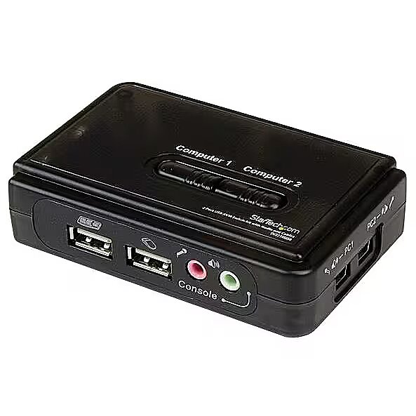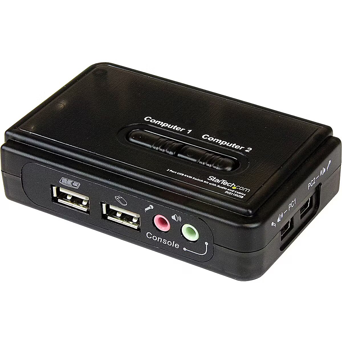 LongDesc - Control 2 USB enabled computers with this complete KVM kit including cablesThe SV211KUSB 2 Port USB KVM Switch Kit with Audio and Cables lets you control two USB-enabled computers using a single keyboard, mouse and VGA monitor and offers both hotkey and top panel push-button operation for simple switching between connected computers. Designed to integrate seamlessly into any environment, the USB KVM switch offers a small footprint design (roughly the size of a deck of playing cards) and draws power from the connected computers, so it doesn't require an external power supply. A suitable solution for virtually any application, the USB KVM switch supports video resolutions of up to 2048 x 1536 as well as audio switching. The USB KVM switch includes two 4ft 2-in-1 VGA and USB Host Cables, providing everything needed for quick installation to provide a complete, out-of-the-box KVM solution. Delivering dependable and convenient control of multiple computers from a single peripheral station, the KVM switch is backed by a StarTech.com 2-year warranty and free lifetime technical support.The StarTech.com Advantage