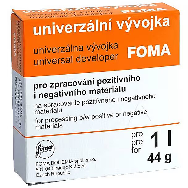 description_en - Foma Universal Developer is a two-component, normal-working powder developer for both film and paper. Foma Universal is a rather unique developer as it has dual use, it can be used to develop black and white photographic papers and films. This makes it a highly versatile developer for all your developing need. Just like any other Foma developer, the preparation of the working solution is an easy task. The powder is dissolved in 800 ml of warm water (50 to 70 °C). The solution is then filled up with water to reach the final volume of 1 liter. The standard dilution for film is 1+3. When developing photographic papers, it is advised to not dilute the developer.