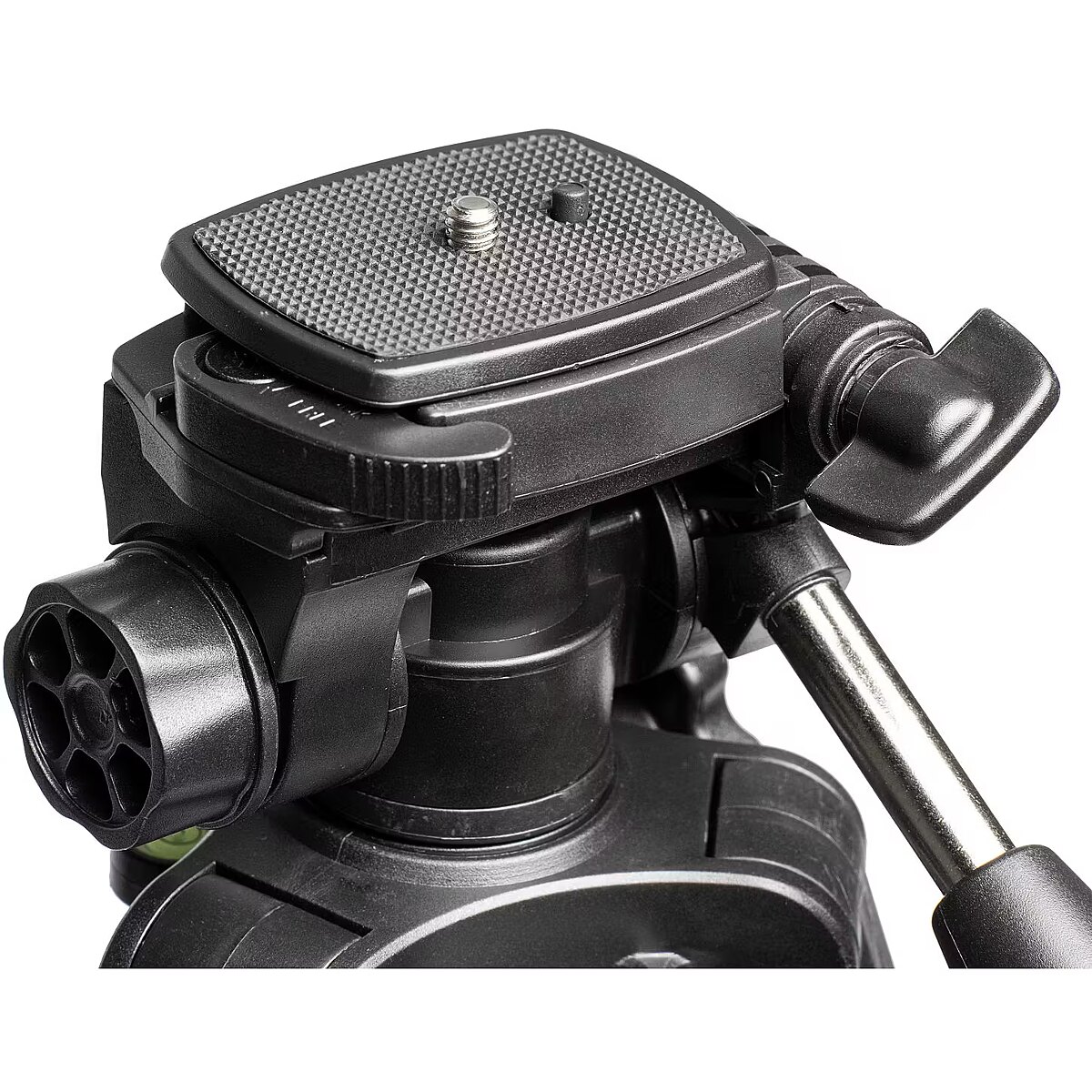The 3-way head allows you to quickly and conveniently change the shooting angle, and the convenient control lever makes moving the tripod head particularly smooth. A built-in level ensures that the tripod is always perfectly balanced. In addition, the quick-mount plate allows the camera to be quickly and easily attached to the tripod. Portable design