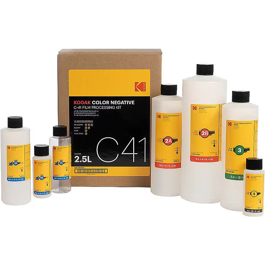 description_en - Kodak Color Negative C-41 Film Processing Kit is an all-in-one solution for developing colour negative and black & white chromogenic films. This versatile kit is compatible with standard C-41 process and can be used with small developing tanks and rotary processors. The kit includes liquid concentrate chemicals that can be easily mixed with water to create 2.5L of working solutions. The chemistry can be used as a one-shot solution or replenished with the appropriate Kodak Color Negative replenisher solutions, available separately. Process a varying number of rolls depending on your unique processing requirements. This new kit is an excellent replacement for the now defunct Tetenal Colortec C-41 Kit. Perfect for fast and hassle free home development of your colour films. The kit includes: Developer 1A, 1B, 1C Bleach 2A, 2B Fixer 3 Final Rinse 4
