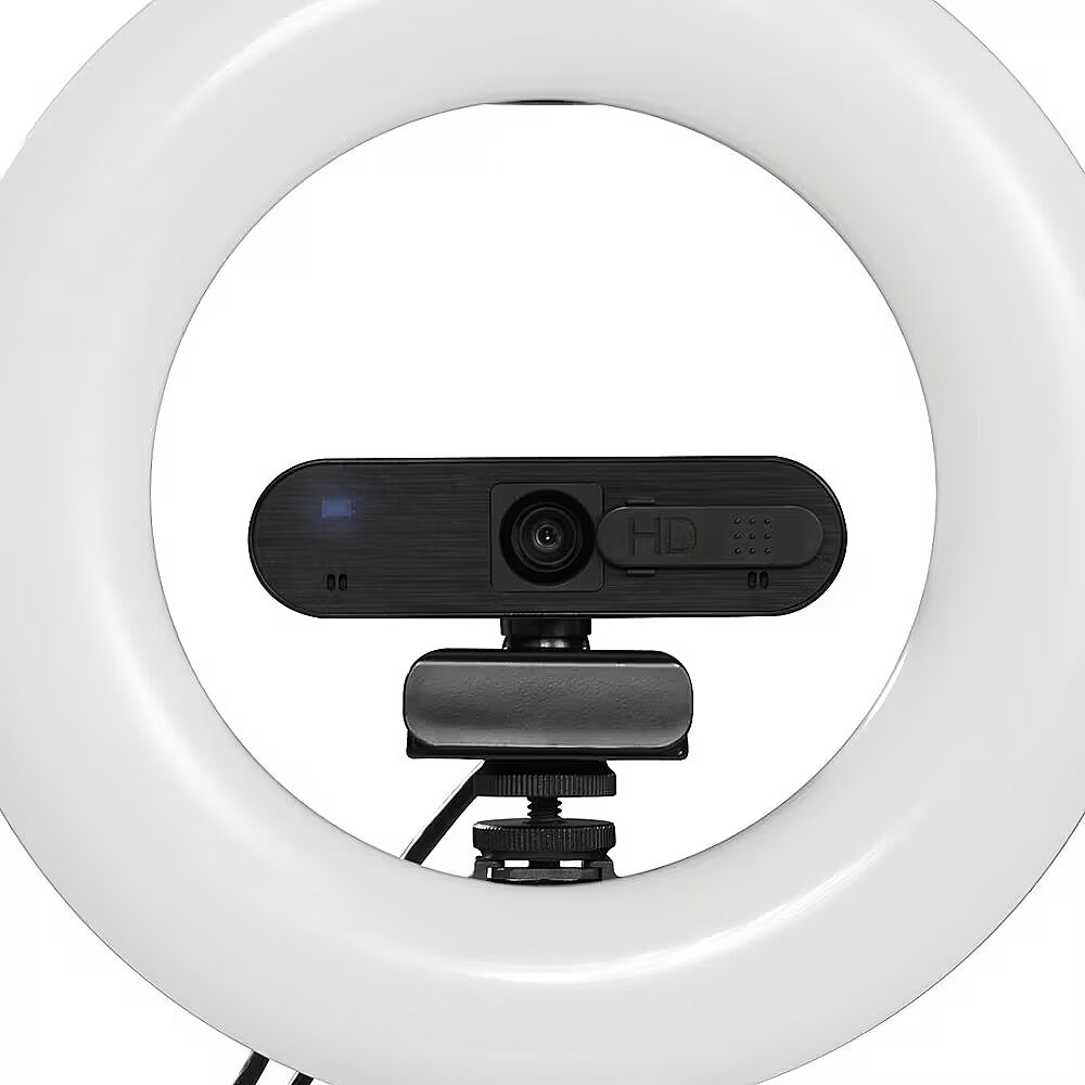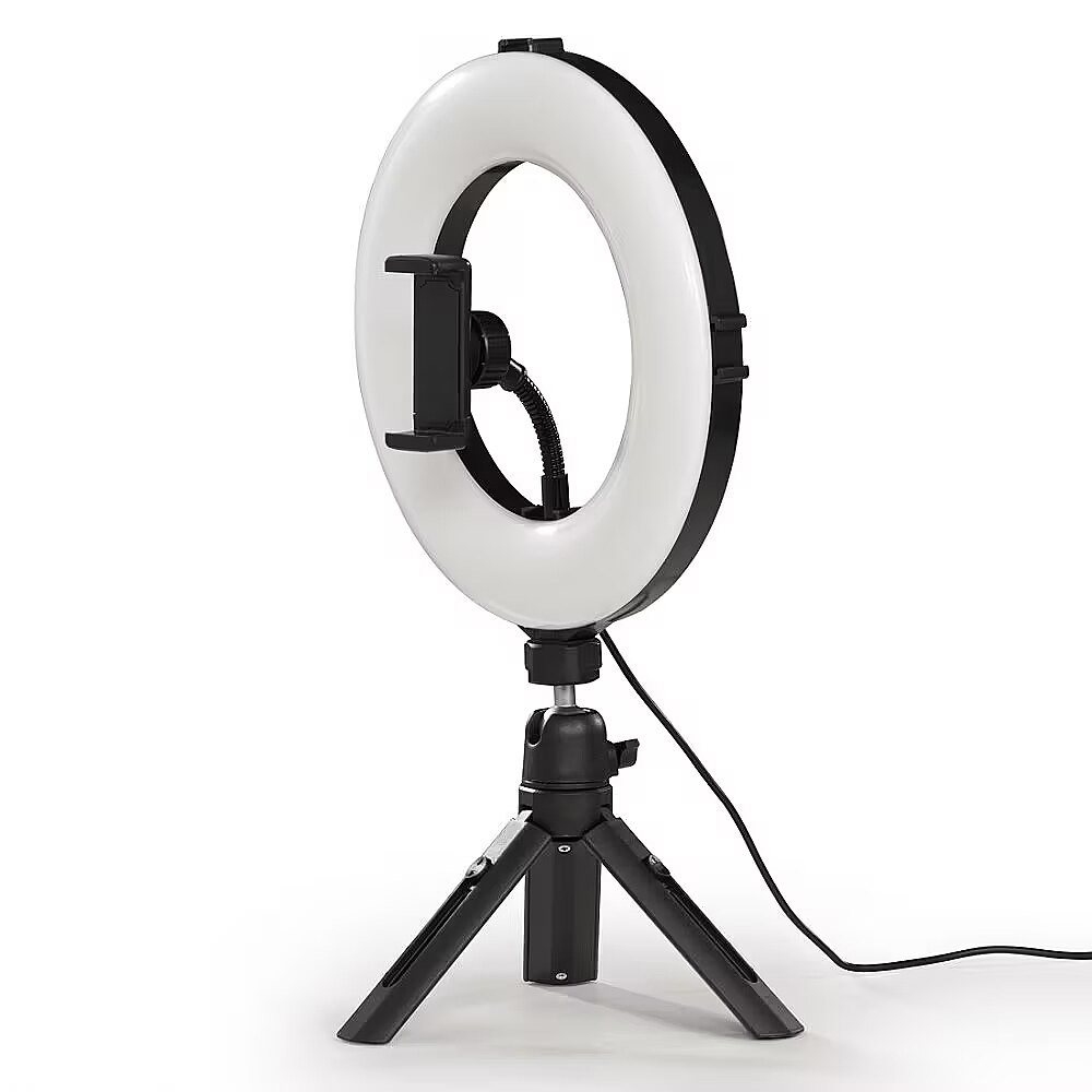 LongDesc - Charming eye effectSparkling charming eye effect: LED ring light magically creates a light in the eyes through reflections3-stage colour temperatureFrom warm white to daylight bright: control the colour temperature in 3 stages using the cabled remote control, for the optimised and even illumination of videos and portraits, for example10-stage light intensityFrom radiantly bright to pleasantly dimmed: the light intensity can be adjusted in 10 stagesTripod ball headUnusual recording angle: ring light can be pivoted and tilted thanks to the tripod ball headBall head and swan neckAlways the perfect recording position: portrait and landscape format thanks to smartphone holder with ball head and flexible swan neckTwo ¼" connectionsOne ring light - two ¼" connection options: the connections are located at the top and bottom for the perfect combination and positioning of equipment such as a webcam and microphoneFour cold shoe connectionsOne right light - four cold shoe connection options: the cold shoe connections are located on all sides for professional and creative photos and videos with further accessories, e.g. microphone, webcam