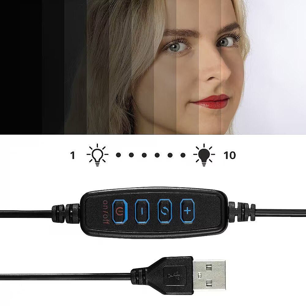 Other features - Średnica zewnętrzna: 21 cm (8) Liczba diod LED: 96 Temperatura barwowa światła: 2100 K/3000 K/5500 K Lumeny: 950 Długość kabla USB-A: 190 cm Pasuje do smartfonów o szerokości 6 8 cm Regulacja wysokości statywu: 13,5 17,5 cm Regulacja wysokości nóg: 4-stopniowa Antypoślizgowe nogi Adapter zimnej stopki na 1/4" Zasilanie: USB 5V/1,8A