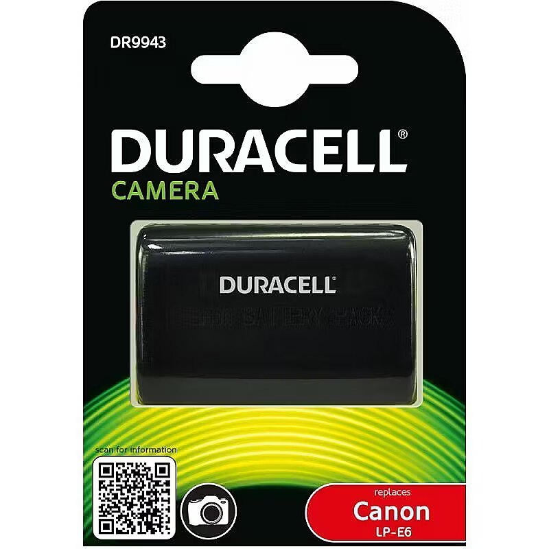LongSummaryDescription - Duracell Camera Battery - replaces Canon LP-E6 Battery. Battery technology: Lithium-Ion (Li-Ion), Battery capacity: 1600 mAh, Purpose: Camera. Width: 38 mm, Depth: 56 mm, Height: 20 mm. Quantity per pack: 1 pc(s), Package width: 84 mm, Package depth: 119 mm
