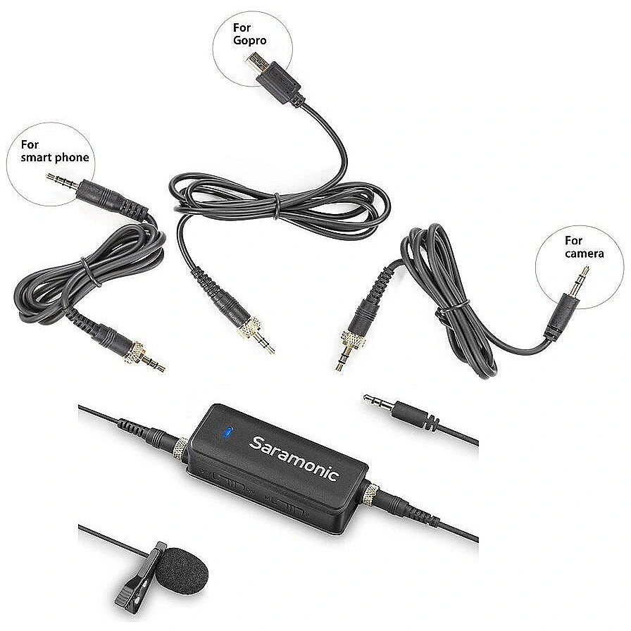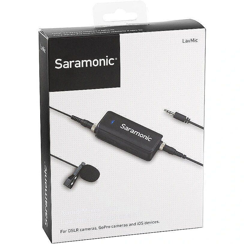 description_en - If you jump between shooting video with DSLRs, GoPros, and Apple devices, and you need an excellent sounding clip-on lavalier microphone that will work perfectly with all of them, the Saramonic LavMic is the answer. Not only does it supply broadcast-quality sound to a range of different kinds of cameras with its included wired lavalier microphone, it also features a second microphone input so you can attach an additional microphone to your device of choice. The second microphone input is provided by the included miniature audio mixer. This unit also supplies a headphone jack, so you can always listen to your sound when you shoot. A Mono/Stereo switch is also provided, which gives you the option to record a single microphone to both tracks of your camera (Mono mode) or record two microphones separately on the left and right tracks in your camera (Stereo mode). This kit equips you with several Saramonic products. You get an LM-M1 omnidirectional lavalier microphone that has an 8-foot (2.4m) cable. Its omnidirectional pickup pattern is the best choice for video production, as it provides smooth and even sound. You also get a Saramonic LM-CC1, which is a dedicated output cable for GoPro cameras (Hero3 and 4 models), an LM-PC1 cable for connecting to iPhones, iPads, and iPod Touches, and an LM-GC1 for connecting to DSLR, mirrorless, and other video cameras. The included microphone and cables feature locking mechanisms, so they won’t accidentally get unplugged. Note: The LM-CC1 cable is not compatible with Hero Basic and Hero4 Session Gives you the ability to connect more than one mic to DSLRs, GoPros, video cameras, and Apple devices Included wired lavalier microphone provides broadcast-quality sound Headphone output so you can always hear your audio Gain knob for setting perfect levels, Mono/Stereo switch for output mode selection Powered by a single AAA battery, blue LED power indicator