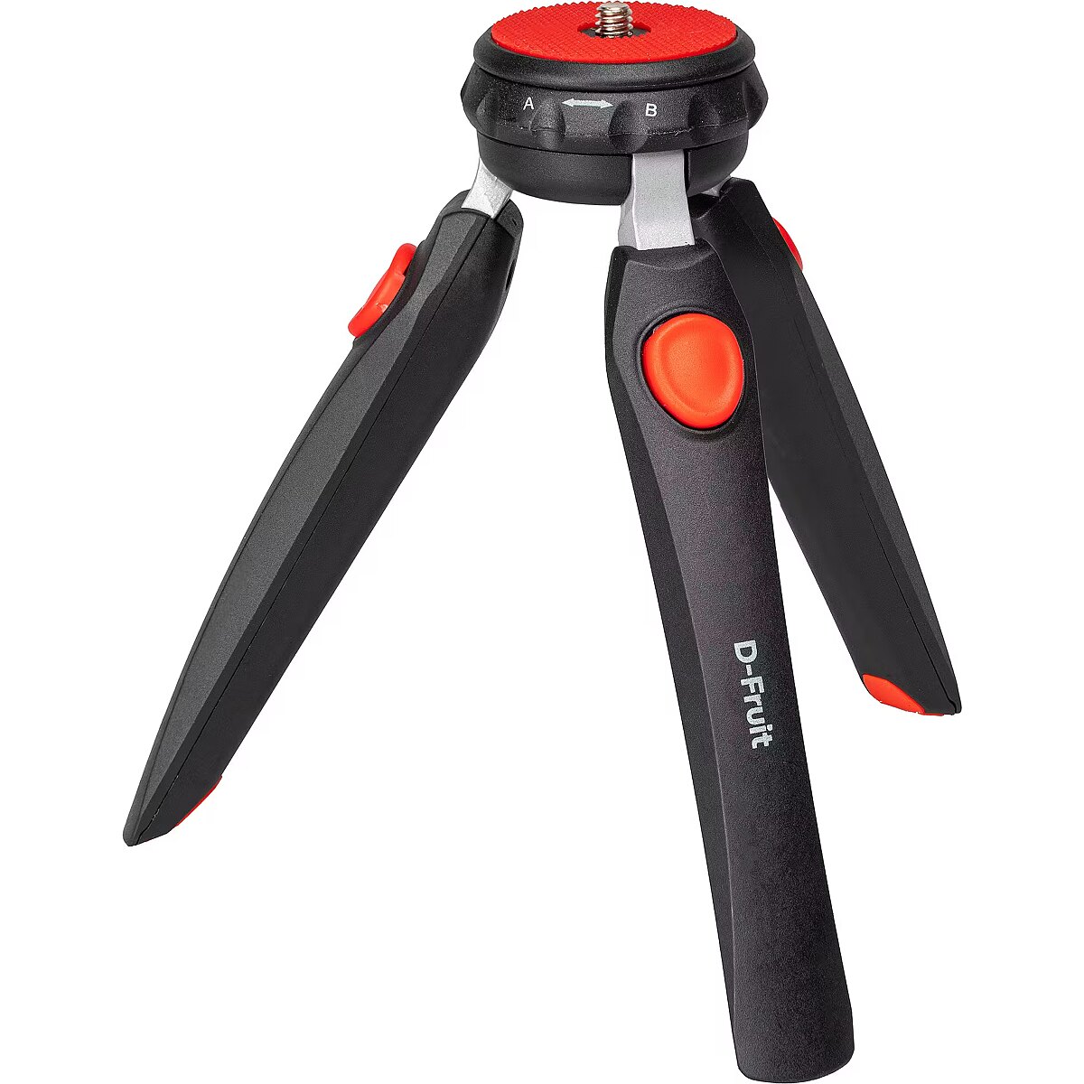 description_et - Kaks ¼” keeret, horisontaalseks või vertikaalseks kinnituseks Sobilik nutitelefonidele laiusega vahemikus 58-89 mm Parema haakumise tagamiseks varustatud pehmete silikoonpadjanditega D-Fruit Mini statiiv on ideaalne kaaslane kõigile, kes kasutavad pildistamiseks või filmimiseks nutitelefoni või hübriidkaamerat. See on kerge, mugav kaasas kanda ning kompaktne. Soovid statiivi kasutada mugava käepidemena videote salvestamisel? Ainult lükka jalad kokku ning Sul on parem haare olemas. Lisaks on võimalik jalgasid pikendada ning laiali lükata stabiilsuse parandamiseks. D-Fruit Mini on varustatud universaalse nutitelefoni adapteriga, mis võimaldab statiivile kinnitada enamik nutitelefone. Samuti on sel 1/4" keere kergema kaamera kinnitamiseks.