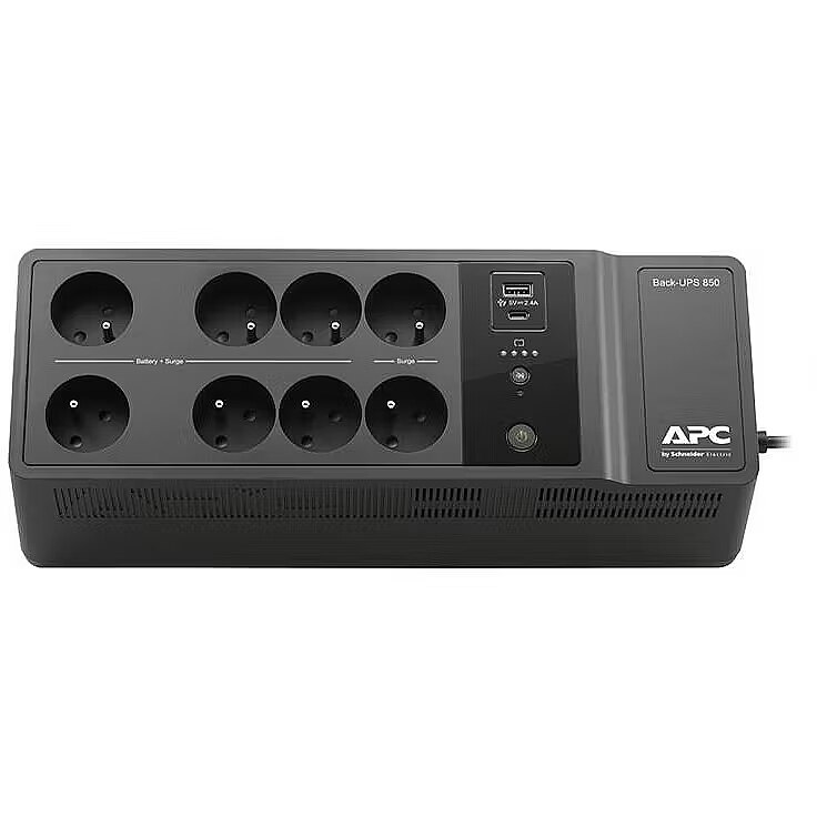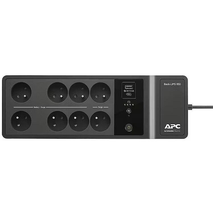Description - Output power capacity: 520 Watts / 850VA Output Connections: (6) French/Belgian (Battery Backup), (2) French/Belgian (Surge Protection) APC Back-UPS 850VA, 230V, USB Type-C and A charging ports Battery Backup & Surge Protector for Electronics and Computers Adjustable voltage sensitivity Provides the ability to adapt the UPS for optimal performance in specific power environments or generator applications. Audible alarms Provides notification of changing utility power and UPS power conditions Automatic self-test Periodic battery self-test ensures early detection of a battery that needs to be replaced. Battery charging indicator Lets you know when your battery is charging and when it is fully charged. Battery failure notification Provides early-warning fault analysis on batteries enabling timely preventive maintenance Building Wiring Fault Indicator This LED informs users of potentially dangerous wiring problems in the wall circuit. Cold-start capable Provides temporary battery power when the utility power is out. Dataline surge protection Provides protection of connected equipment from power surges on the data lines. Disconnected battery notification Warns when a battery is not available to provide backup power. Hot-swappable batteries Ensures clean, uninterrupted power to protected equipment while batteries are being replaced Safety-agency approved The UPS is UL1778 Listed Simple battery replacement Increases UPS availability by allowing quick, easy battery replacement. USB charging ports Allows you to simultaneously charge and power your mobile phone and handheld computer using APC USB charging cables (sold separately). USB connection Use your PC to access additional power protection and management features for your UPS via a USB Port. User-replaceable batteries Increases availability by allowing a trained user to perform upgrades and replacements of the batteries reducing Mean Time to Repair (MTTR)