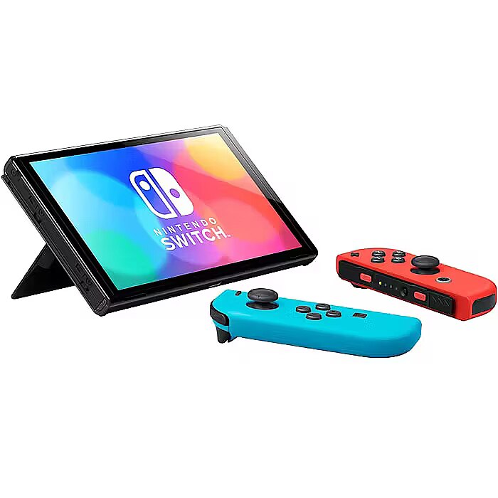 LongDesc - Meet the newest member of the Nintendo Switch familyThe new system features a vibrant 7-inch OLED screen, a wide adjustable stand, a dock with a wired LAN port, 64 GB of internal storage, and enhanced audio.7-inch OLED screenFeast your eyes on vivid colors and crisp contrast when you play on-the-go.See the difference the vibrant screen makes, whether you're racing at top speed or squaring off against enemies. Wide, adjustable standFlip out the sturdy stand for easy viewing in Tabletop mode.Find your best angleAdjust the stand to find the optimal viewing angle—perfect for a quick multiplayer game with a buddy.Built-in wired LAN portConnect online** using the dock’s LAN port when playing in TV mode.64 GB internal storageSave games to your system with 64 GB of internal storage.Enhanced audioEnjoy enhanced audio from the system’s onboard speakers.Three modes in oneNintendo Switch and Nintendo Switch (OLED model) systems are designed to fit your life, transforming from home console to portable system in a snap!TV ModeDock your system to enjoy HD gaming on your TV.Tabletop ModeFlip the stand to share the screen, then share the fun with a multiplayer game.Handheld ModePick it up and play with the Joy-Con™ controllers attached to enjoy the 7-inch OLED screen.This is Joy‑Con™The included Joy‑Con controllers give you total gameplay flexibility.Choose your control styleOne controller or two, vertical or sideways, attached to the console or separate. You can play multiple ways, depending on the game.Share with a friendPass a single Joy‑Con to a friend for instant two-player fun. Or invite friends to bring their own for a gaming party!Try something newHD Rumble puts you in the game with physical feedback, while the IR Motion Camera opens up new experiences.