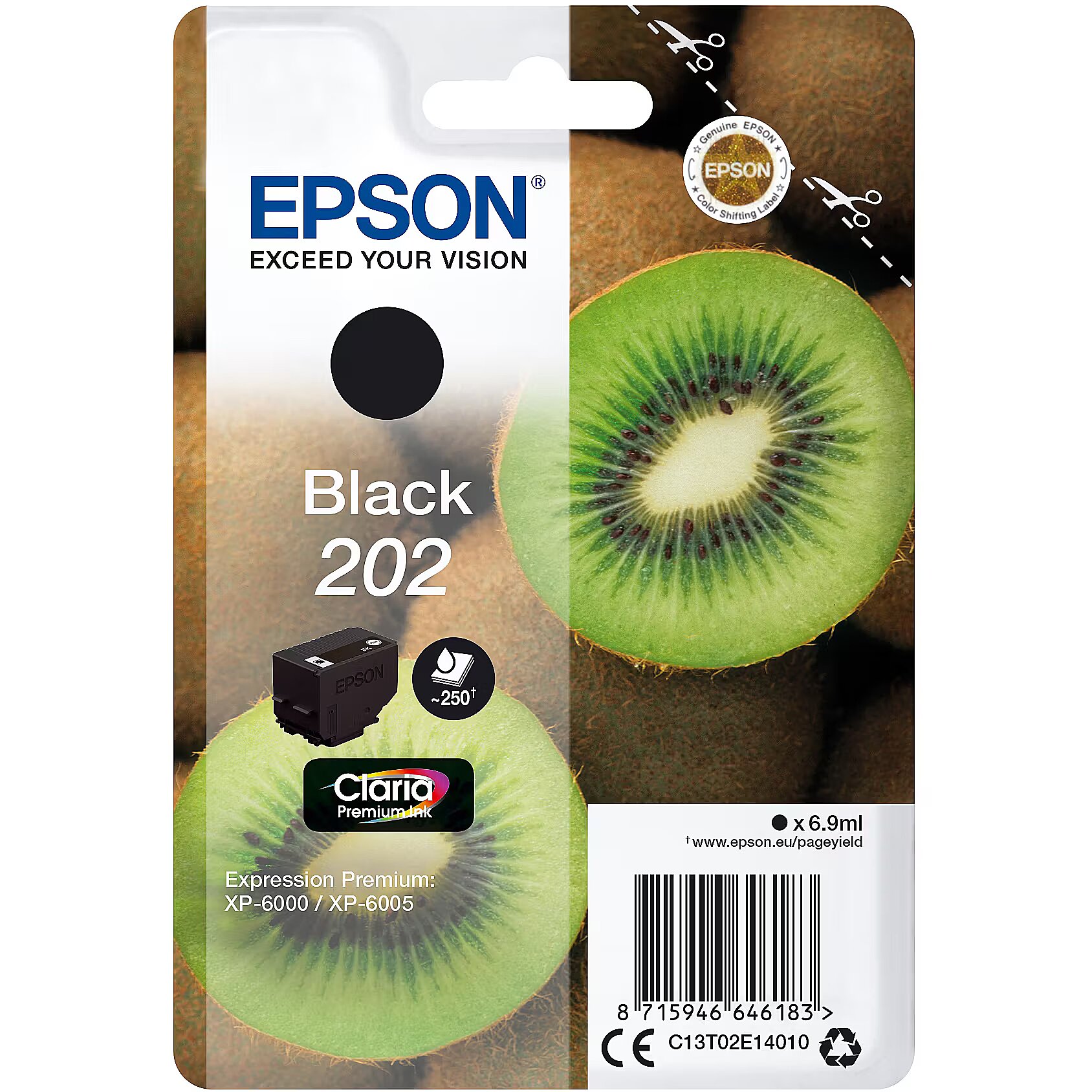 LongSummaryDescription - Epson Kiwi Singlepack Black 202 Claria Premium Ink. Cartridge capacity: Standard Yield, Black ink type: Pigment-based ink, Black ink volume: 6.9 ml, Printing colours: Black, Quantity per pack: 1 pc(s), Black ink page yield: 250 pages