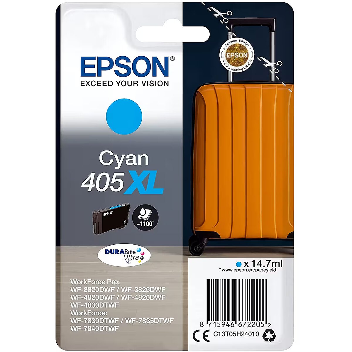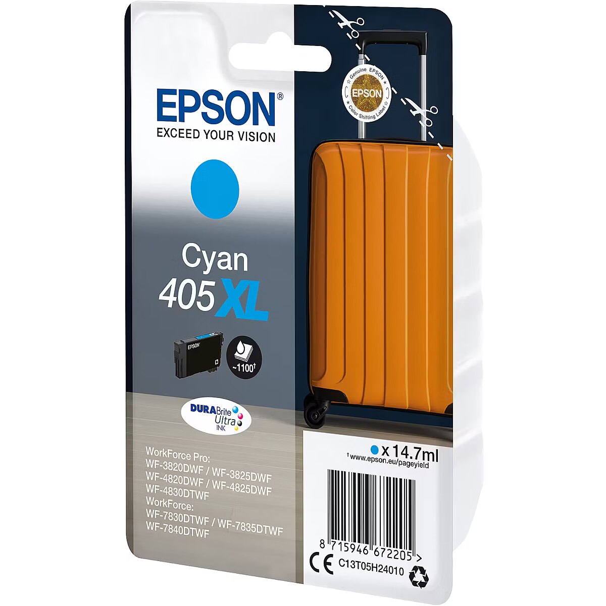 LongDesc - SINGLEPACK CYAN 405XL DURABRITE ULTRA INKEpson's DURABrite Ultra Ink is ideal for producing laser-like, business documents. Thanks to its all-pigment ink system, documents are water, smudge and highlighter resistant and its quick-drying properties make it perfect for duplex printing and there’s an affordable cartridge to suit every type of user with both standard and XL sizes available. Find it easily in store by looking for the Suitcase image.Reduce your printing costs with XL inksTake advantage of the cost-effective DURABrite Ultra Inks. Offering great value, the inks are supplied individually so you only ever have to replace the colour used. Plus with XL cartridges, you can print up to 1,100 black and 1,100 colour pages1. Black XXL cartridges are also available for A3 printer models with a yield of 2,200 pages1.Meet the rangeOur all-pigment DURABrite Ultra Ink creates sharp, long-lasting and robust documents that are water, smudge and highlighter resistant. They’re also quick-drying, which minimises the risk of smudging when printing on both sides.Optimised for Epson printersEpson inks and papers have been developed to work hand-in-hand with Epson printers to produce the best results time and time again.The genuine articleEnjoy hassle-free and reliable printing with Epson's genuine inks. We invest in extensive research, high-tech manufacturing facilities and put our products through rigorous tests, to deliver the best quality product to you.
