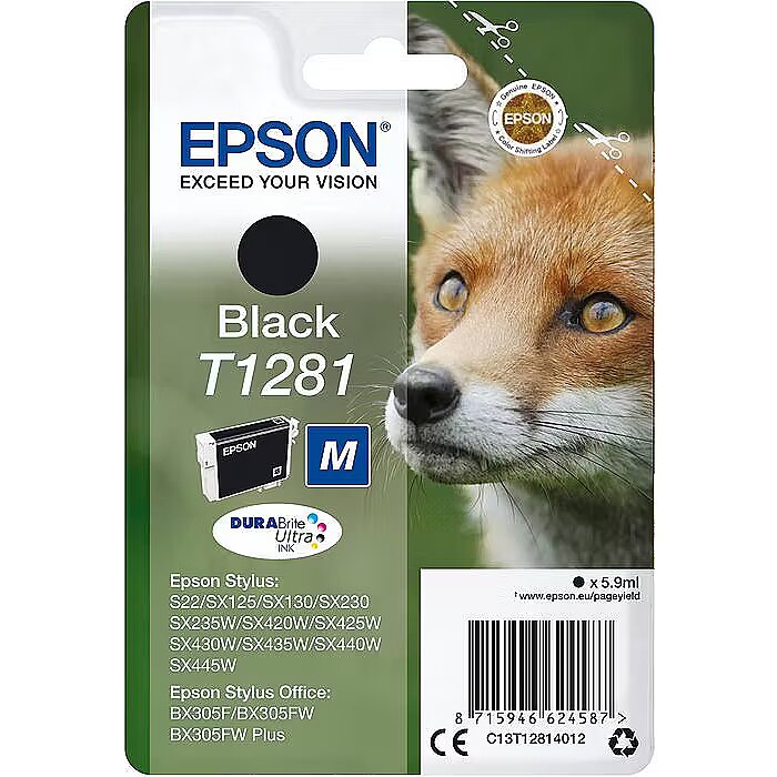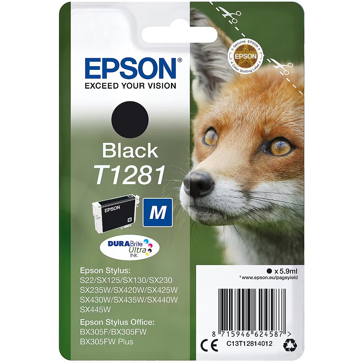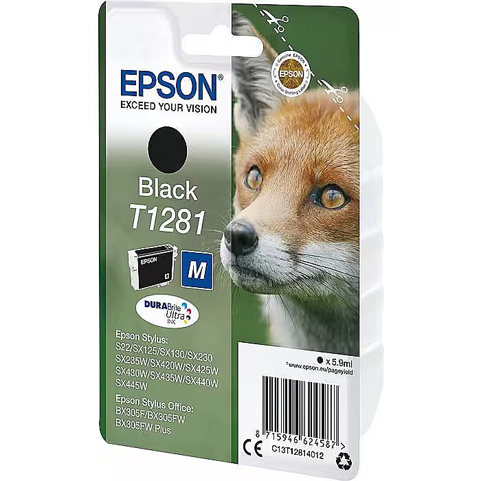 LongSummaryDescription - Epson Fox Singlepack Black T1281 DURABrite Ultra Ink. Black ink type: Pigment-based ink, Black ink volume: 5.9 ml, Printing colours: Black, Quantity per pack: 1 pc(s), Black ink page yield: 185 pages