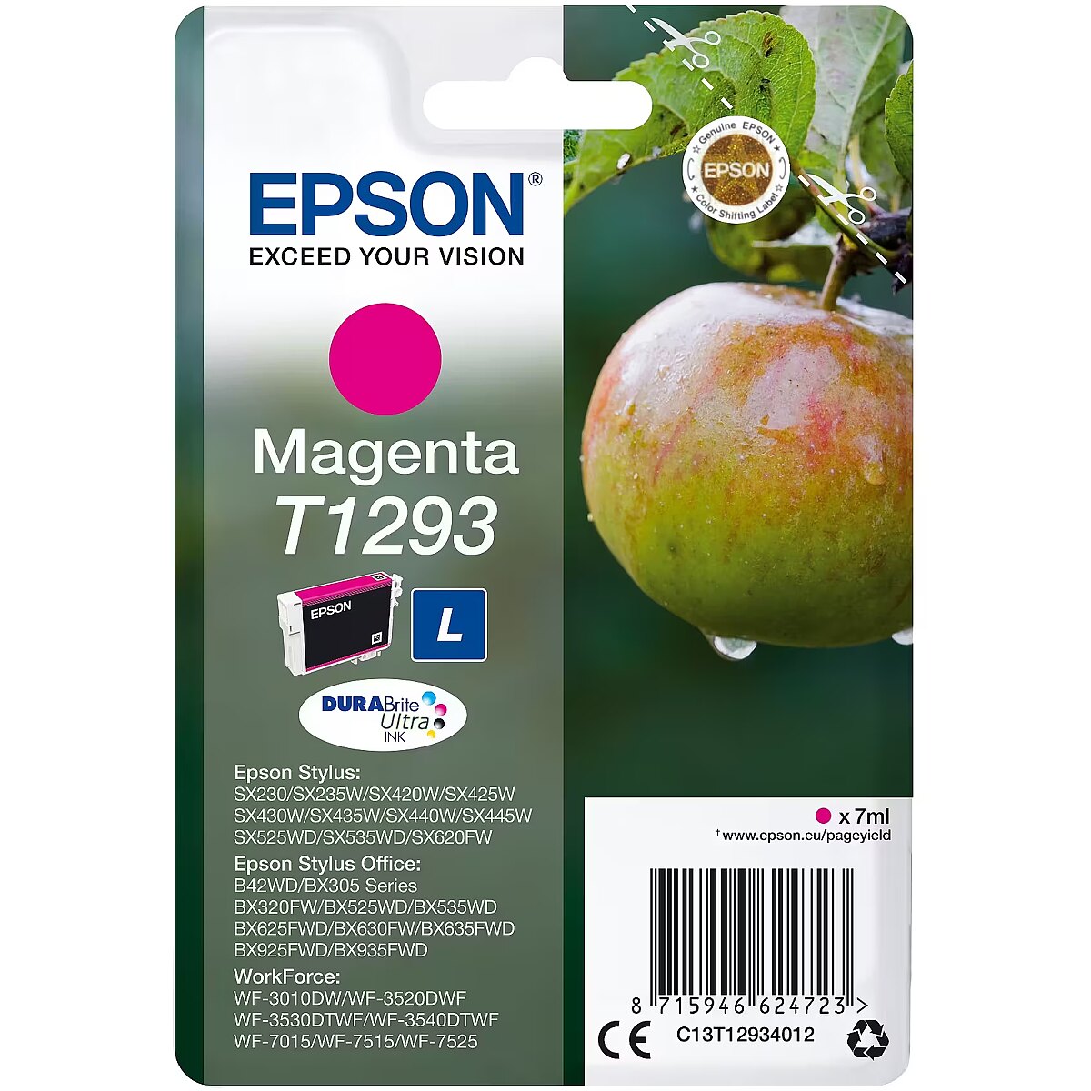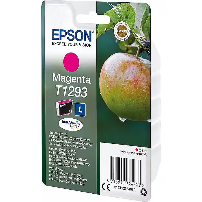 LongSummaryDescription - Epson Apple Singlepack Magenta T1293 DURABrite Ultra Ink. Colour ink type: Pigment-based ink, Colour ink page yield: 378 pages, Colour ink volume: 7 ml, Printing colours: Magenta, Quantity per pack: 1 pc(s)