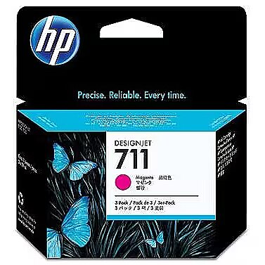 LongSummaryDescription - HP 711 3-pack 29-ml Magenta DesignJet Ink Cartridges. Compatibility: HP DesignJet T120, T520, Printing colours: Magenta, OEM code: CZ135A. Width: 114.8 mm, Depth: 45 mm, Height: 100.1 mm. Package width: 1148 mm, Package depth: 450 mm, Package height: 100.1 mm. Master (outer) cases per pallet: 96 pc(s), Products per pallet: 2304 pc(s), Layers per pallet: 6 pc(s). Pallet dimensions (W x D x H): 1016 x 1219.2 x 1163.3 mm, Stacking number for pallet: 2 pc(s)