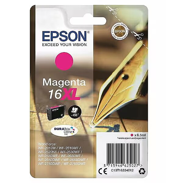 LongSummaryDescription - Epson Pen and crossword Singlepack Magenta 16XL DURABrite Ultra Ink. Colour ink type: Pigment-based ink, Cartridge capacity: High (XL) Yield, Colour ink page yield: 450 pages, Colour ink volume: 6.5 ml, Printing colours: Magenta, Quantity per pack: 1 pc(s)