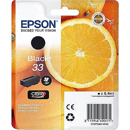 LongSummaryDescription - Epson Oranges Singlepack Black 33 Claria Premium Ink. Cartridge capacity: Standard Yield, Black ink type: Pigment-based ink, Black ink volume: 6.4 ml, Printing colours: Black, Quantity per pack: 1 pc(s), Black ink page yield: 250 pages