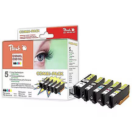 LongDesc - Peach is a leading Swiss brand and supplier of 100%-compatible replacement ink cartridges. Leading-edge technology ensures optimal quality for outstanding results. Colour durability and fade-resistance satisfy the most stringent requirements to guarantee brilliant printouts. To ensure Premium Quality, we manufacture our inks at our own development centre in Switzerland, after which they are injected into the cartridges at our European production site. The latest advances in research and technology flow into our manufacturing and production methods. A quality level that the Asian manufacturers fail to equal, available at very attractive prices. A genuine alternative to expensive OEM products and low-budget inks.Components:- 1 Peach Ink Cartridge Photo black, compatible with CLI-551, CLI-551BK XL- 1 Peach Ink Cartridge black, compatible with PGI-550, PGI-550PGBK XL- 1 Peach XL Ink Cartridge yellow with chip, compatible with CLI-551, CLI-551Y XL- 1 Peach Ink Cartridge magenta, compatible with CLI-551, CLI-551M XL- 1 Peach Ink Cartridge cyan, compatible with CLI-551, CLI-551C XL