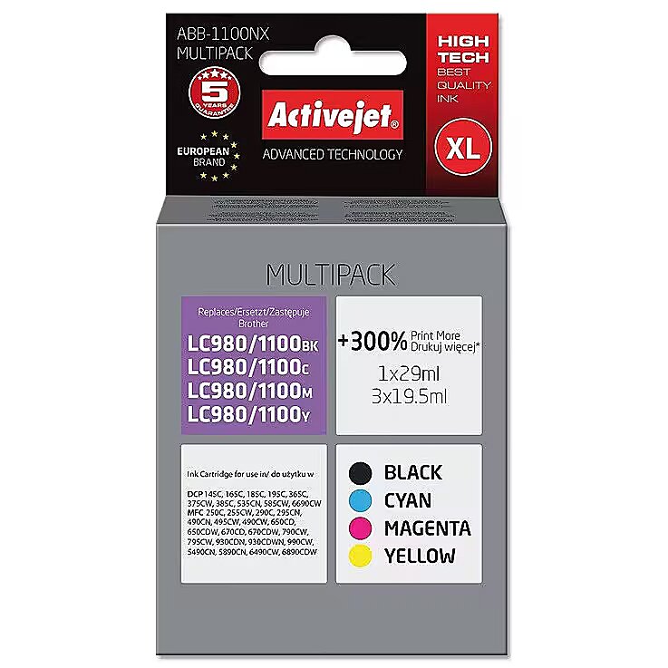 ActiveJet ABB-1100NX (zamiennik Brother LC1100/980; Supreme; 1 x 29 ml, 3 x 19.5 ml; czarny, czerwony, niebieski, żółty)