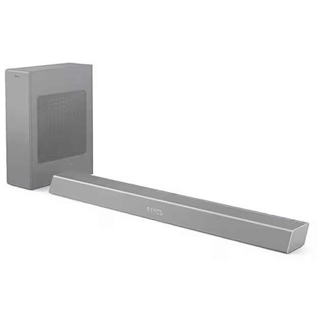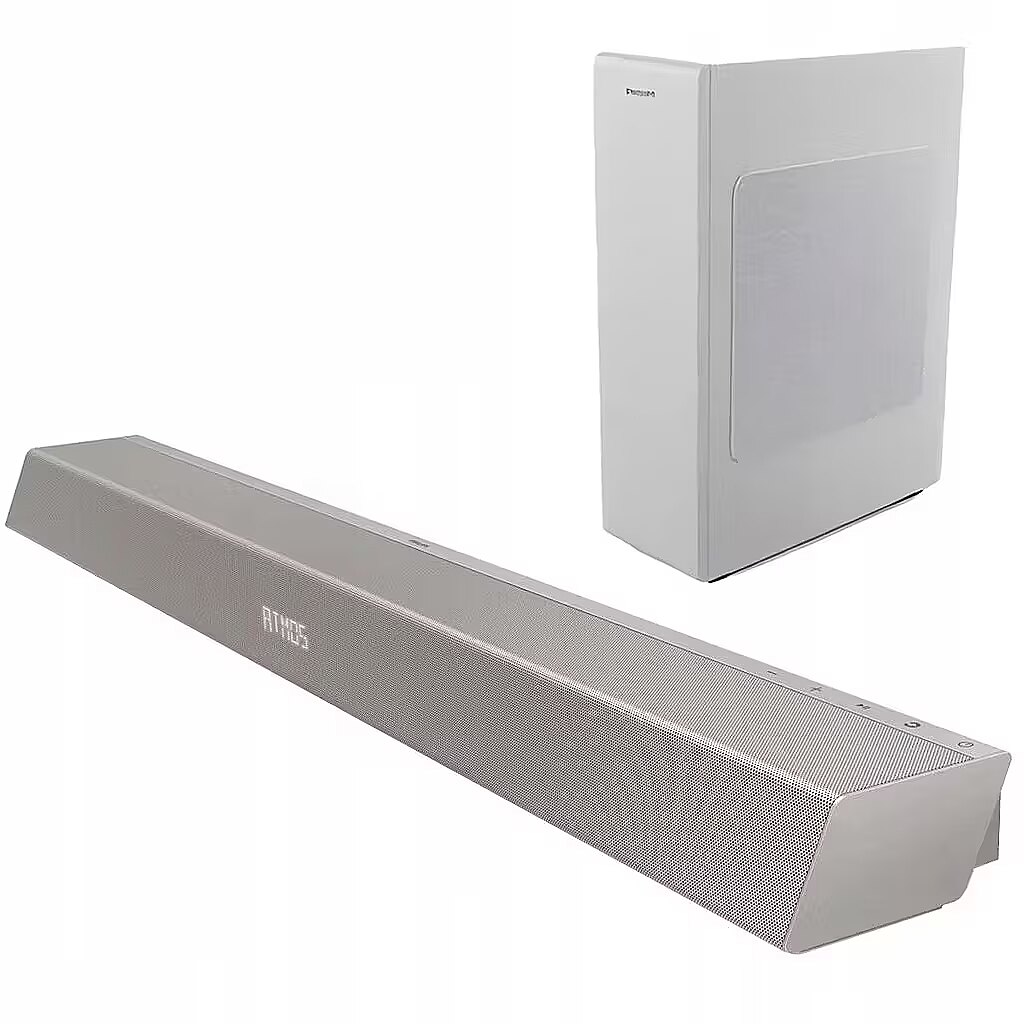 LongSummaryDescription - Philips TAB8505 Dolby Atmos Soundbar 2.1 with Wireless Subwoofer. Audio output channels: 2.1 channels, RMS rated power: 200 W, Audio decoders: Dolby Atmos, Dolby Digital, Dolby Digital Plus, Dolby TrueHD. Soundbar speaker RMS power: 200 W, Impedance: 8 Ω. Subwoofer type: Active subwoofer, Subwoofer connectivity: Wireless, Subwoofer frequency range: 40 - 160 Hz. Product colour: Silver, Audio formats supported: AAC, FLAC, LPCM, MP3, WAV, Virtual assistant: Amazon Alexa & Google Assistant. Connectivity technology: Wired & Wireless