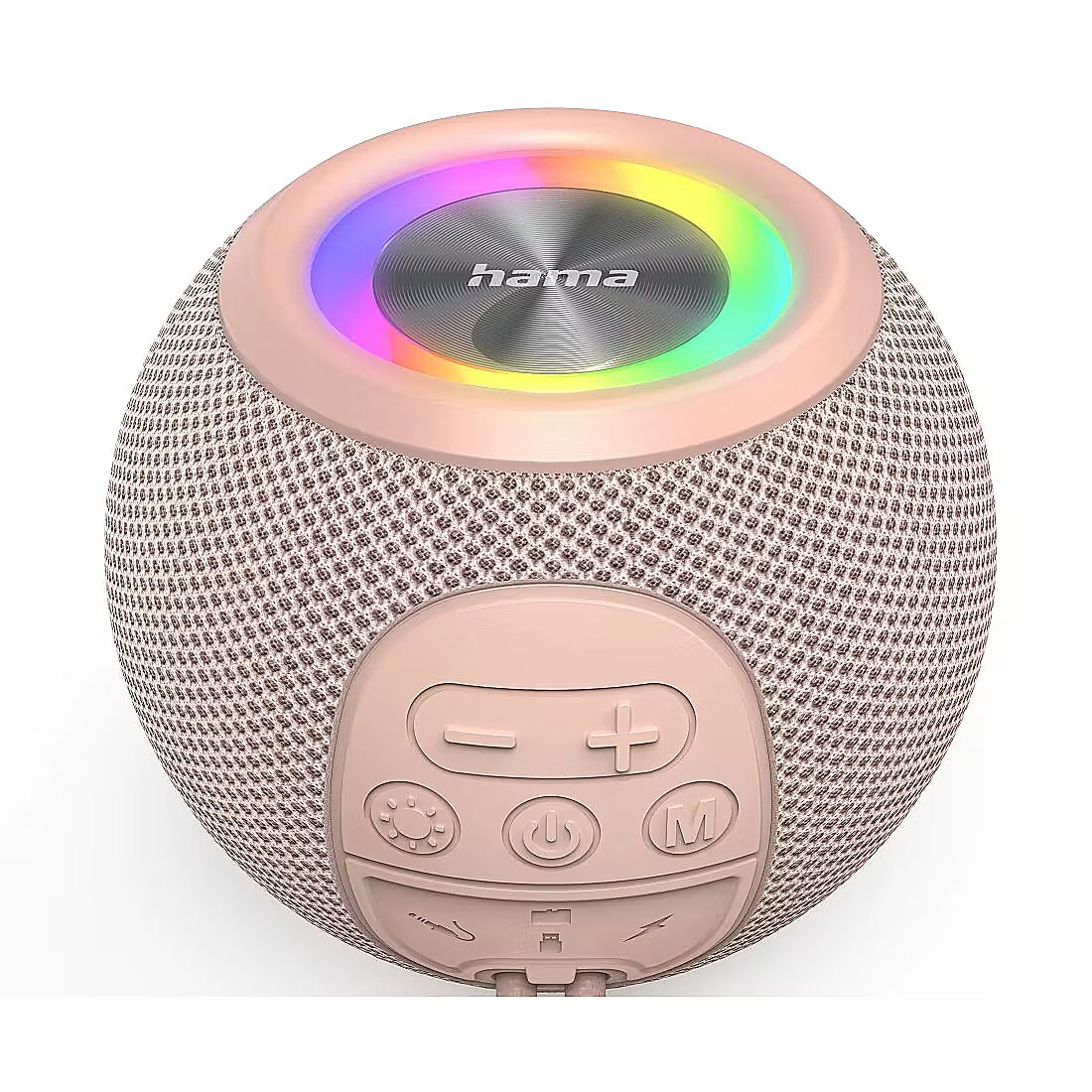 LongSummaryDescription - Hama 00188240. RMS rated power: 5 W. Connectivity technology: Wired & Wireless, Bluetooth profiles: A2DP, AVCTP, HFP, HSP, L2CAP, Bluetooth range: 10 m. Product type: Mono portable speaker, Product colour: Pink, Product design: Ball. Recommended usage: Universal, Compatible memory cards: MicroSD (TransFlash). Battery type: Built-in battery, Battery technology: Lithium-Ion (Li-Ion), Battery capacity: 1200 mAh