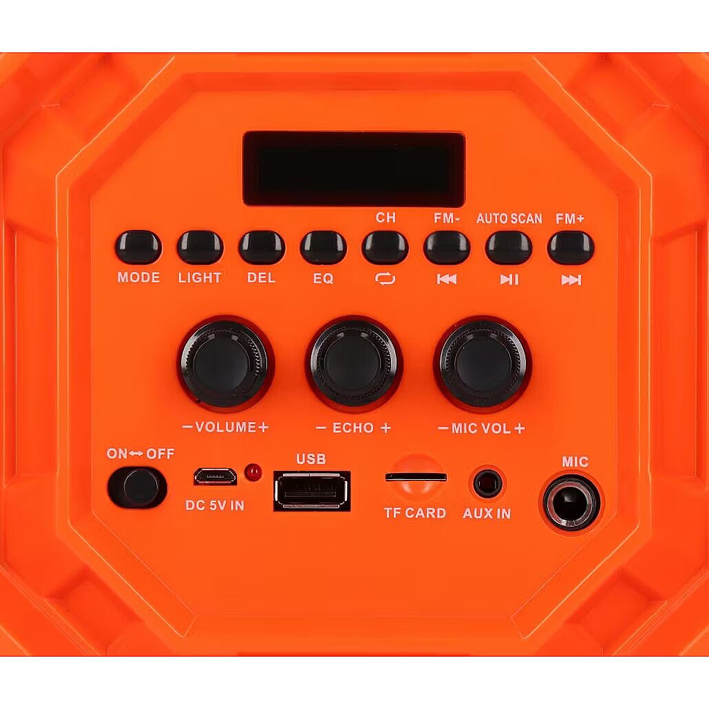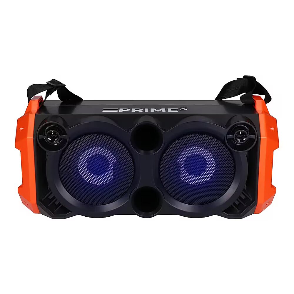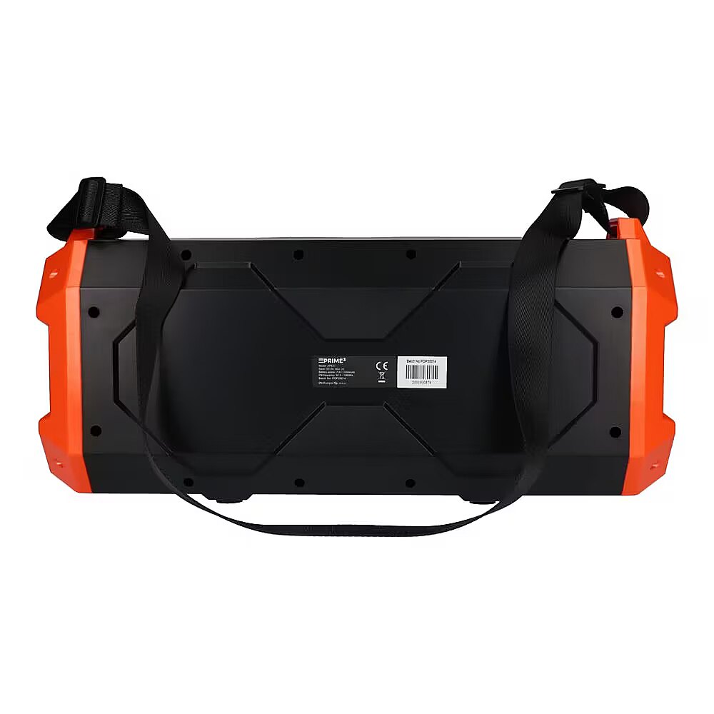 Description - AUDIO SYSTEM WITH BLUETOOTH AND KARAOKE FUNCTION "SLAM!" APS31 An inseparable companion for outdoor meetings! Karaoke function Power: 3200 W P.M.P.O. Bass reflex The new PRIME3 portable speaker looks like a professional mini audio system. SLAM! However, APS31 is not only about design, it also has excellent sound quality and a number of functions that will be appreciated by all users. SLAM speaker! it has a built-in Bluetooth module that allows you to play music via the audio streaming profile directly from your phone or laptop, as well as a microSD memory card slot and a USB port to which you can connect a pendrive. Thanks to the AUX input, it can also be connected, using a dedicated cable, to an MP3 player, a computer without Bluetooth functionality or a CD player. What's more, it also has an FM radio. Thanks to the function of remembering your favorite stations, you only need to search for their frequencies once and save them in the device's memory. High-quality sound is another feature that characterizes the new PRIME3 loudspeaker. We owe it to 3200 W P.M.P.O. and a total musical power of 100 W. In turn, the use of a Bass reflex housing allowed the APS31 to be more efficient in the low frequency range and reduce non-linear distortions. The equalizer function is also important, as it allows you to adjust the low and high tones. A loudspeaker with such parameters must play loud, strong and clean! This is not all we can get with the APS31 model. It is equipped with a karaoke function with a 6.5 mm microphone jack, used in all professional sound systems, as well as multi-color LED backlighting. It is also possible to optimize the echo effect using a separate knob. By using these functions, you can play the role of your favorite music star at any event and shine in the spotlight. The loudspeaker is perfect not only for karaoke games, but also in any situation where we want to be heard by a larger audience, e.g. at meetings, matches, in a lecture hall or during a school assembly. APS31 is equipped with an intuitive control panel for all functions. On the side of the speaker there is a clear display showing the functions currently used by the user, control buttons and sockets for connecting external devices. Thanks to this arrangement, the equipment is very simple and convenient to use. With the SLAM! speaker APS31, partying to the sounds of the best hits can last for up to 5 hours. This is possible thanks to the built-in battery with a capacity of 2000 mAh. Charging the battery fully takes less than 3 hours. Convenient carrying is possible thanks to the attached strap, thanks to which the speaker can be thrown over the shoulder and taken with you anywhere. APS31 is made of solid black plastic with orange accents, which makes it look extremely modern.