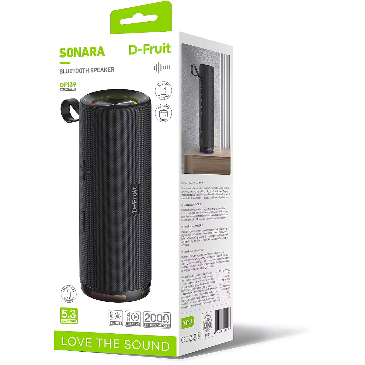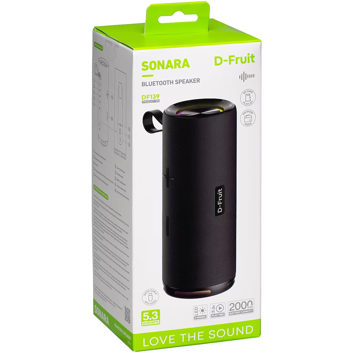 description_en - The D-Fruit Sonara portable Bluetooth speaker is a great choice for listening to music and podcasts anytime, anywhere. Thanks to the wireless connection, you can quickly connect it to your phone, tablet or laptop and enjoy music without the hassle of wires. The built-in battery provides up to 4 hours of uninterrupted listening pleasure. Three different RGB light modes create a mood and add colorful vibrancy to the listening experience. The small and lightweight speaker fits easily into any bag, making it an ideal choice for listening to music at home, gardening or traveling. High-quality sound reproduction always ensures a pleasant listening experience. Compact portable speaker Clear and pure stereo sound FM radio function Listen to music from a memory card Integrated noise-canceling microphone for hands-free calls Bluetooth 5.3 ensures a stable wireless connection RGB lighting with three modes 2000 mAh integrated battery Battery lasts up to 4 hours Fast and convenient charging with USB-C charging cable Charging cable included Removable wrist strap